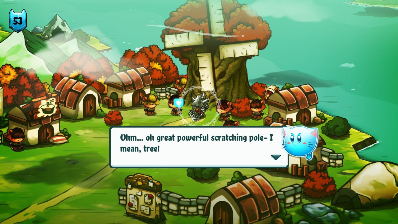 Das Abenteuer startet so verhängnisvoll, wie es für Spiele dieser Art hin und wieder üblich ist: Während einer Bootsfahrt wird die Schwester des Helden vom teuflischen Drakoth gekatznappt, der kurz darauf auch noch das Boot selbst versenkt, wodurch das Kätzchen in der wundersamen Welt von Felingard strandet. Hier übernimmt man die Kontrolle und darf sich erstmal auf der Oberwelt orientieren. Allerdings dauert der Frieden nur sehr kurz an, denn der kratzbürstige Feind stellt den Helden vor die Aufgabe, stärker zu werden und so seine Schwester zu retten. Und damit beginnt auch schon das Abenteuer, das im übrigen vollständig auf Deutsch übersetzt worden ist. Mit dem Fokus auf der englischen Sprache und der Menge an Wortspielen mit Katzenbezug kann man sich denken, dass diese schwer zu retten sind. Das Lokalisations-Team hat hier jedoch recht gute Arbeit geleistet und nur selten auf Biegen und Brechen versucht, wirklich jeden Witz auch im Deutschen anzuwenden. Trotzdem gibt es hier und da ein paar Abschnitte, wo auffällt, wie sehr sie es trotzdem versucht haben (Wie etwa „Katzen-Kollegah“ für „Pawtner“). Diese stören allerdings im Spielverlauf eher weniger. Das könnte allerdings auch daran liegen, dass die Hauptgeschichte nicht sonderlich lang ist. Bereits nach gut vier Stunden werden schnelle Spieler diese beenden können und selbst wenn man sich anschließend daran macht, alles zu 100% abzuschließen, steigt die Spielzeit höchstens auf etwa das doppelte, also rund acht Stunden.