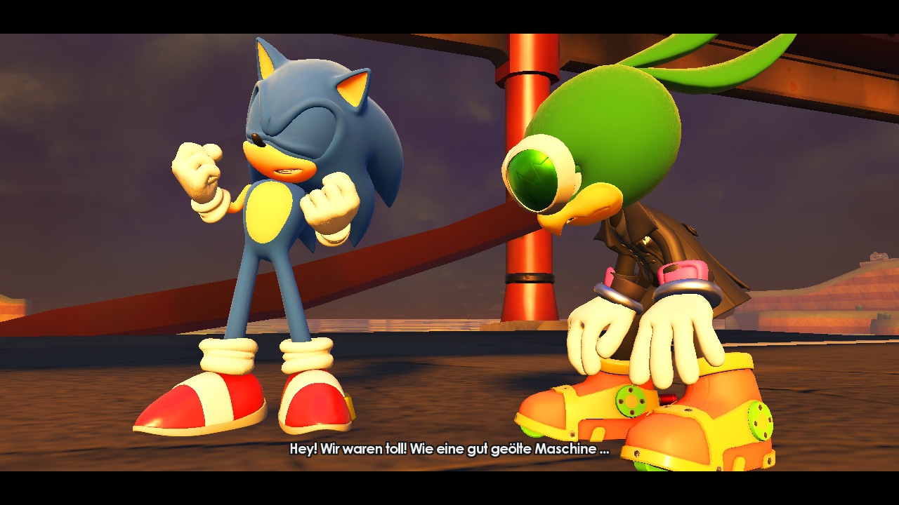 Ebenfalls muss man Sonic Team anerkennen, dass Switch-Besitzer – anders als zu Zeiten von Sonic Unleashed - nicht mit einer eigenen Version abgespeist werden, sondern tatsächlich dasselbe Spielerlebnis vorgelegt bekommen wie die Zocker auf anderen Systemen. Technische Einbußen müssen natürlich trotzdem hingenommen werden: So wirkt das Bild im TV-Betrieb leicht verwaschen und blass, während auf dem Switch-Screen selbst die Farben kräftiger ausfallen, dafür hingegen bei den Texturen im Direktvergleich Abstriche gemacht wurden. Viel schwerer wiegt jedoch die auf 30 Bilder pro Sekunde limitierte Bildrate, die bei der Abschätzung schneller, hakeliger Passagen zur Herausforderung wird. Auch hilft nicht, dass eure Figur bei den großzügig ausstaffierten Umgebungen gerne mal im Hintergrund verschwindet, was die Hüpferei ebenfalls frustrierender macht. Außerdem wurden alle vorgerenderten Videosequenzen eher mäßig komprimiert, was für einen noch verwascheneren Look sorgt. Immerhin kann sich die musikalische Komponente dafür hören lassen. Sonic Forces bietet für alle drei Charaktere einen eigenen, passenden Musikstil. So wetzt der moderne Igel etwa zu leicht rockigen Stücken durch die Weltgeschichte, während der Mania-Held Songs im Stile der Mega Drive-Klassiker spendiert bekommen hat. Dasselbe Lob gilt leider nicht für die deutsche Sprachausgabe, die leider an anständiger Regie vermissen lässt und teilweise hölzern oder schlichtweg fehlbetont klingt. Immerhin sind unter anderem auch die japanische und die englische Tonspur mit an Bord und Letztere klingt meines Erachtens deutlich besser als das deutsche Gegenstück.