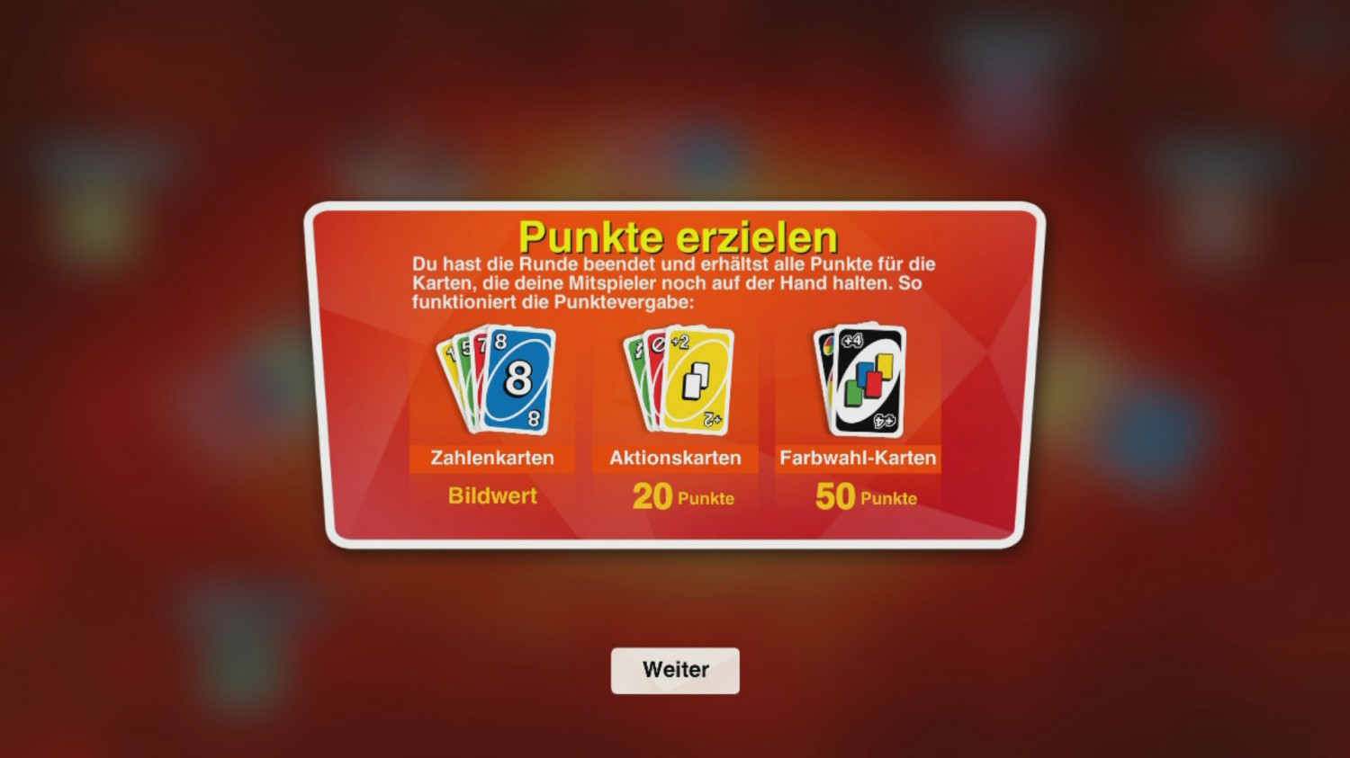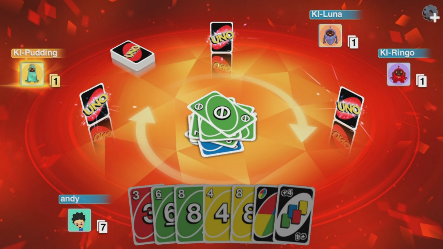 An einer Konsole können bis zu zwei Spieler gleichzeitig Spielen, allerdings nicht gegeneinander, sondern nur miteinander im Koop-Modus. Das ist leider schade, auf der anderen Seite ergibt dies aber auch Sinn. Wie soll man auch die Karten des Mitspielers verdecken? Auf der Wii U hätte das prima geklappt. Für zwei Spieler am selben Gerät steht nur der Koop-2vs2-Modus gegen die KI zur Verfügung, dort sieht man schließlich ohnehin die Karten des Partners. Dann wird eben Solo gespielt. Was mir besonders gefällt, sind die Einstellungsmöglichkeiten der Partien. So kann ich mein eigenes, mir vertrautes Regelwerk einstellen. Darunter sind die Extra-Regel, „Zieh 2”- oder „Zieh 4”-Karten zu stapeln und die Strafe weiterzugeben, das Dazwischenlegen, wenn man eine identische Karte auf der Hand hält, und dass man so lange Karten ziehen muss, bis man eine passende gezogen hat und diese Karte anschließend spielen muss. Die Spielvariationen „7-0 Uno” und die Anfecht-Methode können ebenfalls eingestellt werden. „7-0” kannte ich nur aus der Spielanleitung der analogen Version. Bei dieser Version kann ich meine Karten tauschen, wenn ich eine 7 lege. Legt jemand eine 0, werden alle Karten weitergereicht. Das Anfechten von „Zieh 4“-Karten war mir jedoch neu. Wenn ich vier Karten vom Stapel ziehen müsste, könnte ich dies Anfechten. Sollte der Spieler, der den Zug gespielt hat, nicht die Farbe, die er gewählt hat, auf der Hand haben, muss er selbst vier Karten ziehen. Hat er sie doch, muss ich ganze sechs Karten ziehen. Diese Regel bringt etwas mehr Spannung ins Spiel und ist im Standard-Regelwerk eingeschaltet. Gespielt wird, bis jemand keine Karten hat. Das „UNO”-Rufen wird dabei nicht außer Acht gelassen. Alle übrigen Karten der verbleibenden Mitspieler werden zusammengezählt und der Gewinner bekommt die Summe der Kartenwerte. Je nachdem wie das Ergebnislimit eingestellt wurde, hat man nach 200 bis 500 Punkten gewonnen. Ein Match bis 500 Punkte kann dabei gern eine halbe Stunde lang dauern.