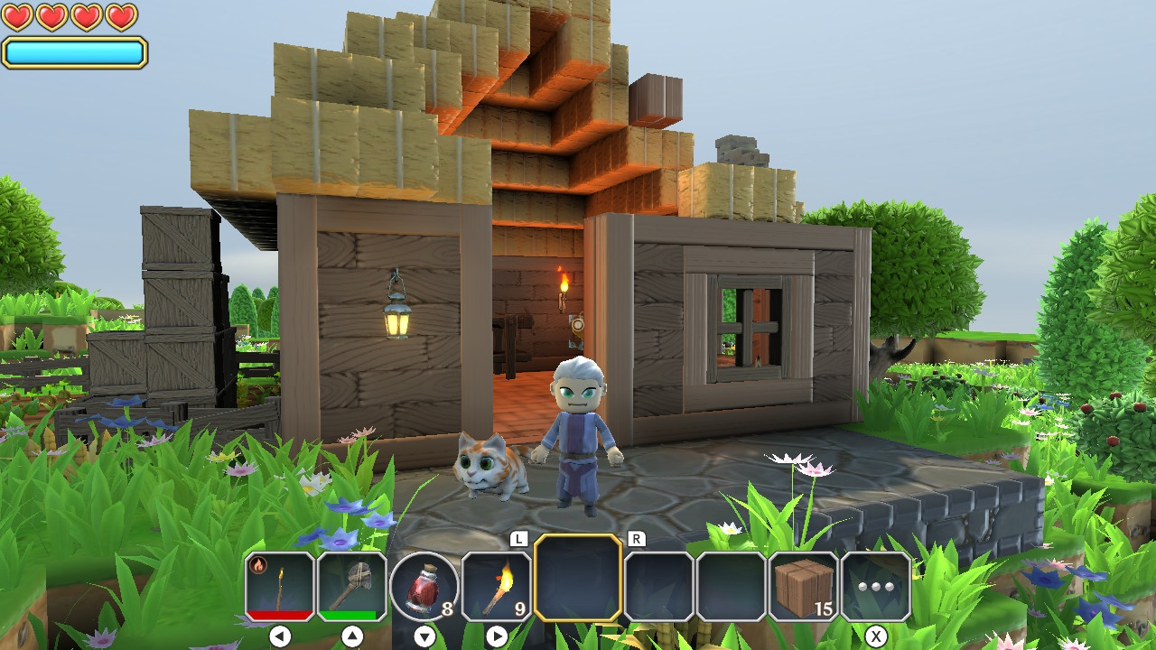 Die Ausgangslage ist recht simpel: Die Spielwelt wurde eines unglückseligen Tages zersplittert und besteht nun nur noch aus schwebenden Inseln, die man über Portale erreichen kann. Abenteurer, die sich zwischen den Gebieten bewegen und sich den Gefahren des Unbekannten stellen, nennt man Portal-Ritter – und genau zu diesem Stand gehört auch ihr. Dazu erschafft ihr mit Hilfe eines überschaubaren Charaktereditors eure Spielfigur und legt sie auch auf eine von drei Charakterklassen fest, die eure Performance im Kampf beeinflusst. Danach generiert ihr eine Welt – euer Switch-Profil erlaubt die Sicherung von bis zu dreien gleichzeitig – und werdet umgehend auf die erste Insel befördert. Die generelle Größe der Insel lässt sich bei der Weltengenerierung übrigens als „groß“ oder „klein“ festlegen, wobei die Miniatur-Variante teilsweise fast schon klaustrophobisch klein wirkt. Trotzdem gibt es in beiden Ausgaben reichlich Baufläche für kreative Schöpfungen und wenn euch etwas nicht gefällt oder ihr durch eventuelle Updates hinzugefügte Elemente in eure bestehende Welt einbauen möchtet, könnt ihr sie auf Wunsch neu generieren lassen. Da euer Charakter separat von den Welten gesichert wird, bleibt beim Sprung zwischen den Universen sogar euer Rucksack-Inventar und euer Erfahrungslevel erhalten. Praktisch!
