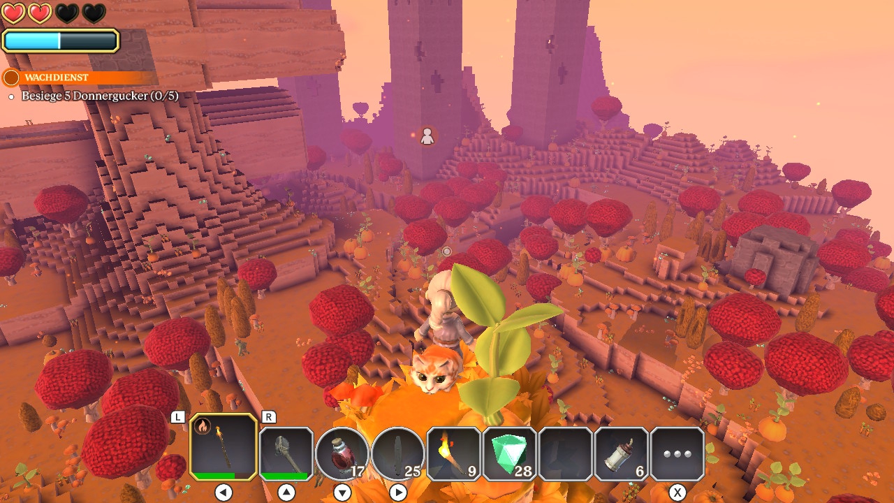 Moment mal, Erfahrungslevel? Jepp, Portal Knights setzt ziemlich deutlich auf RPG-Elemente, womit auch der Kampf gegen mal mehr, mal weniger gefährliche Kreaturen zum Alltag eines Portal-Ritters gehört. Dank Zielanvisierung behält man dabei, nicht unähnlich der Zelda-Reihe, seinen Gegner immer gut im Blick. Unter Standard-Einstellung geschieht dies übrigens vollautomatisch, wenn man in einen Kampf verwickelt wird, was meines Empfindens nach eher nervt als hilft. Der Auto-Fokus lässt sich jedoch glücklicherweise abschalten. Die drei Klassen mit ihren eigenen Waffen – Schwert, Bogen und Zauberstäbe – spielen sich dabei auch deutlich unterschiedlich, sonderlich komplex werden die Gefechte natürlich trotzdem so gut wie nie. Lediglich die wenigen Bosskämpfe fordern von euch etwas mehr Aufmerksamkeit und Durchhaltevermögen. Trotzdem sollte man sich den vielfältigen Wesen stellen, denn nicht nur gibt es für den Sieg Erfahrungspunkte für Levelaufstiege und Spezialisierungen, sondern auch Materialien.