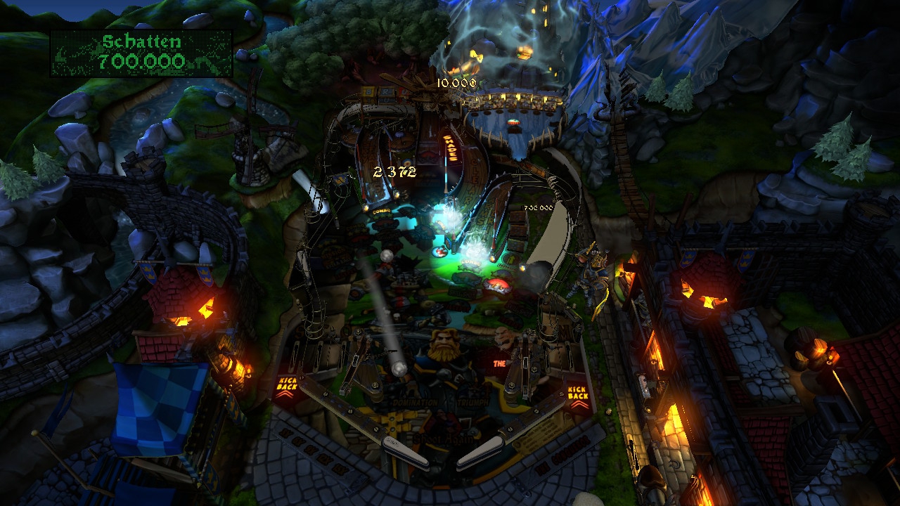 Auch wenn das Paket sich als Bündel originaler Zen-Tische versteht und entsprechend auch im Spiel gelistet wird, ist CastleStorm technisch gesehen ein Lizenz-Flipper – nur dass die zugrundeliegende Lizenz Zen Studios selbst gehört. Der Aufbau der Spielfläche gibt sich dabei recht simpel und ist entsprechend schnell verinnerlicht. Der Fokus liegt auf dem Bespielen der Rampen, die größtenteils ebenfalls rampenlastige Missions-Modi aktivieren. Kleine Wachmacher wie der titelgebende Sturm auf ein Schloss bei einem Miniflipper in der oberen rechten Spielfeldecke oder das Abschießen von langsam in Richtung Flipperarme marschierenden Vikingern sorgen dafür, dass euch dabei nicht langweilig wird. Auch bieten die Aufträge zumindest einiges fürs Auge, wenn etwa im Schatten-Modus die Nacht hereinbricht und geisterhafte Gestalten die Bahnen heimsuchen oder der klassische Drache mit seinem Feueratem Wege versperrt – und die Flipper-Kugel, sollte sie in die Flammen geraten, kompromisslos einschmilzt. Alles in allem ein kurzweiliger, wenn auch eher simpler Tisch.