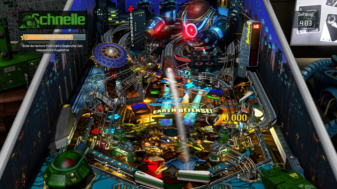 Deutlich knalliger geht es da schon bei Earth Defense zur Sache, den 3DS-Zocker womöglich aus Zen Pinball 3D (zum Test) wiedererkennen. Der Schauplatz ist hier die Erde, die sich gerade gegen eine Invasion der außerirdischen Roboter wappnet. Euer Ziel ist es, die Scharen in Schach zu halten, Zivilisten zu evakuieren und Gegenangriffe zu starten. Interessant hierbei: Während der normalen Flipperei läuft ein Countdown bis zur großen Invasion runter, nach dessen Ablauf ein spezieller Multiball-Modus gestartet wird – mit etwas Geschick lassen sich hier massig Punkte absahnen! Aber auch die anderen Missions-Modi sind nicht gerade geizig, wenn es um den Score geht. Das macht vor allem das Vervollständigen der Challenge-Modi vergleichsweise einfach, unspaßig wird der Tisch dadurch aber nie. Im Gegenteil: Der Punkteregen, der intern auch mit auf der Spielfläche aufleuchtenden Orden prämiert wird, motiviert ungemein. Nicht zuletzt wirkt Earth Defense vom Design her so, als könne es ihn beinahe auch in Wirklichkeit geben. Lediglich der etwas flexiblere Groß-Roboter mit seinen vielseitigen Schussfunktionen erinnert daran, dass dies hier ein reiner Videospieltisch ist. Alles in allem eine runde Sache!