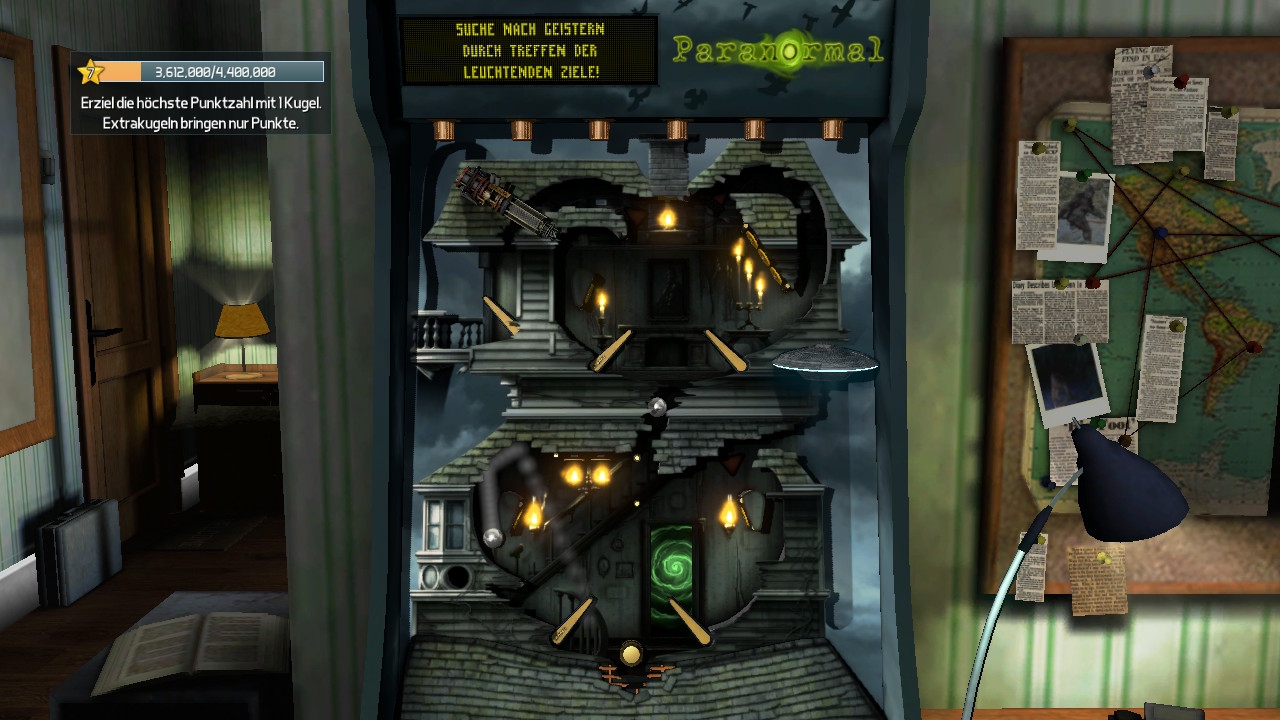 Der letzte Flipper im Bunde ist Paranormal und der entfernt sich vom Weltall-Alien-Thema. Stattdessen dreht sich hier alles um Großstadtlegenden und mythische Wesen – egal ob Nessie, der Chupacabra oder der Jersey Devil, das Kreaturen-Aufgebot ist vielfältig. Sogar ein von Geistern verseuchtes Spukhaus gibt es in Form eines kleinen Minispiels, das in den Kopfaufsatz integriert wurde. Im starken Kontrast zu Mars ist dieser Tisch hier ziemlich dicht bestückt, was auf den ersten Blick etwas unübersichtlich wirken mag. Schnell merkt man jedoch, dass hinter dem Wahnsinn Methode steckt und in Windeseile sind die Bahnenverläufe verinnerlicht. Ebenfalls interessant: Die Missions-Modi sind Multiball-Modi, für die ihr zunächst Kugeln einlagern und anschließend die aktive durch ein mit Magneten versehenes Miniatur-Labyrinth schleusen müsst. Knifflig und doch lohnenswert, denn die Modi selbst fallen ziemlich einfallsreich aus und greifen verschiedene Phänomene wie Levitation auf. Definitiv einer der kreativeren und abwechslungsreicheren Tische, die Pinball FX3 zu bieten hat.
