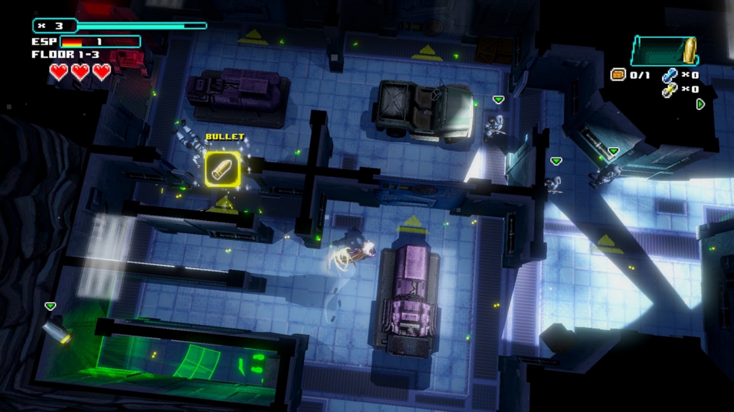 Munition ist nicht die einzige Sache, die ich mit mir herumtrage und die stark limitiert ist. Auch Rauch- und EMP-Granaten kann ich in den verschiedenen Basen finden, die mir beim Kampf gegen die Gegner helfen. Zuletzt gibt es noch Schlüsselkarten, die bestimmte Türen öffnen, aber erst von bestimmten Gegnern abgenommen werden müssen. Hinter diesen verschlossenen Türen liegen meist kleine Perks wie die erhöhte Chancen auf Herz-Pickups. Diese sind nämlich besonders wichtig, da mein Agent nur drei Treffer aushalten kann. An Terminals gibt es zufällig entweder neue Munition oder Spionage-Punkte zum Sammeln. Für besagte Punkte haben die Entwickler ein Multiplikatorsystem eingebaut: Beim Ausschalten von Gegnern und Kameras/Geschütztürmen erhöht sich der Multiplikator. Dieser läuft dann entsprechend ab, je höher der Multiplikator desto schneller. Um mit möglichst vielen Spionage-Punkte aus dem Level zu kommen, gilt es also für mich erst das Level von Gegnern zu säubern um mit dem höchstmöglichen Multiplikator Terminals, Schränke und verschlossene Türen zu öffnen um Spionage-Punkte einzusacken. Am Ende der Strecke steht dann wieder der bekannte Aufzug und hin und wieder ein kleiner Verkaufsstand, der von einem freundlichen Roboter betrieben wird wo ich meine Spionage-Punkte in neue Munition, Leben oder Perks eintauschen kann.