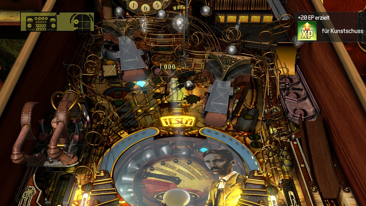 Das Highlight im Bunde dürfte hingegen Tesla sein. Wobei „Highlight“ ein großes Wort ist, denn so wirklich überragend ist dieser Tisch auch wieder nicht. Thema des Flippers ist der titelgebende Erfinder, entsprechend präsentiert sich alles in einem Mix aus Steampunk und Elektro-Technik alter Zeiten. An Spulen wird der Score verbessert, mit Kunstschüssen stockt ihr euer Punktekonto (sowie das Bankkonto des virtuellen Nikola Tesla) auf und über eine gewöhnungsbedürftige Magnetfläche in der oberen rechten Ecke gelangt ihr zu den netten Missions-Modi, bei denen es zum Beispiel darum gilt, die Weichen der Rampen korrekt auszurichten. Das unterhält in gewisser Weise auch, fällt aber leider insgesamt durch die gleichströmigen Ziele eher eintönig aus.