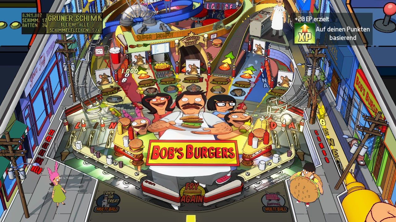 Wesentlich ruhiger – zumindest vom Ton her – geht es bei Bob's Burgers zur Sache. Hier geht es um den Alltag in einer stinknormalen Burger-Bude, also stellt ihr etwa durch gut abgestimmte Kombo-Schüsse Burger zusammen oder haut auftauchende Ratten-Fallziele um, damit das Gesundheitsamt euch fernbleibt. Interessanterweise können hier mehrere Missionen parallel laufen, was für angenehm hektische Situationen sorgen kann. Genau so, wie man es sich eben in einem Fast-Food-Restaurant vorstellt! Ein tischexklusives Gimmick gibt es hier übrigens ebenfalls. Im Laufe eurer Spielzeit (oder durch Gedrückthalten der A-Taste) ändert sich nämlich die Tageszeit und nachts, wenn der Laden geschlossen ist, wartet ein komplett anderer Satz Missionen auf euch. Insgesamt also ein ziemlich trickreicher und spaßiger Tisch… wenn da nicht die ständigen Flatulenz-Laute wären, die zum Soundtrack gehören. Gegen sowas müsst ihr also durchaus gestählt sein.