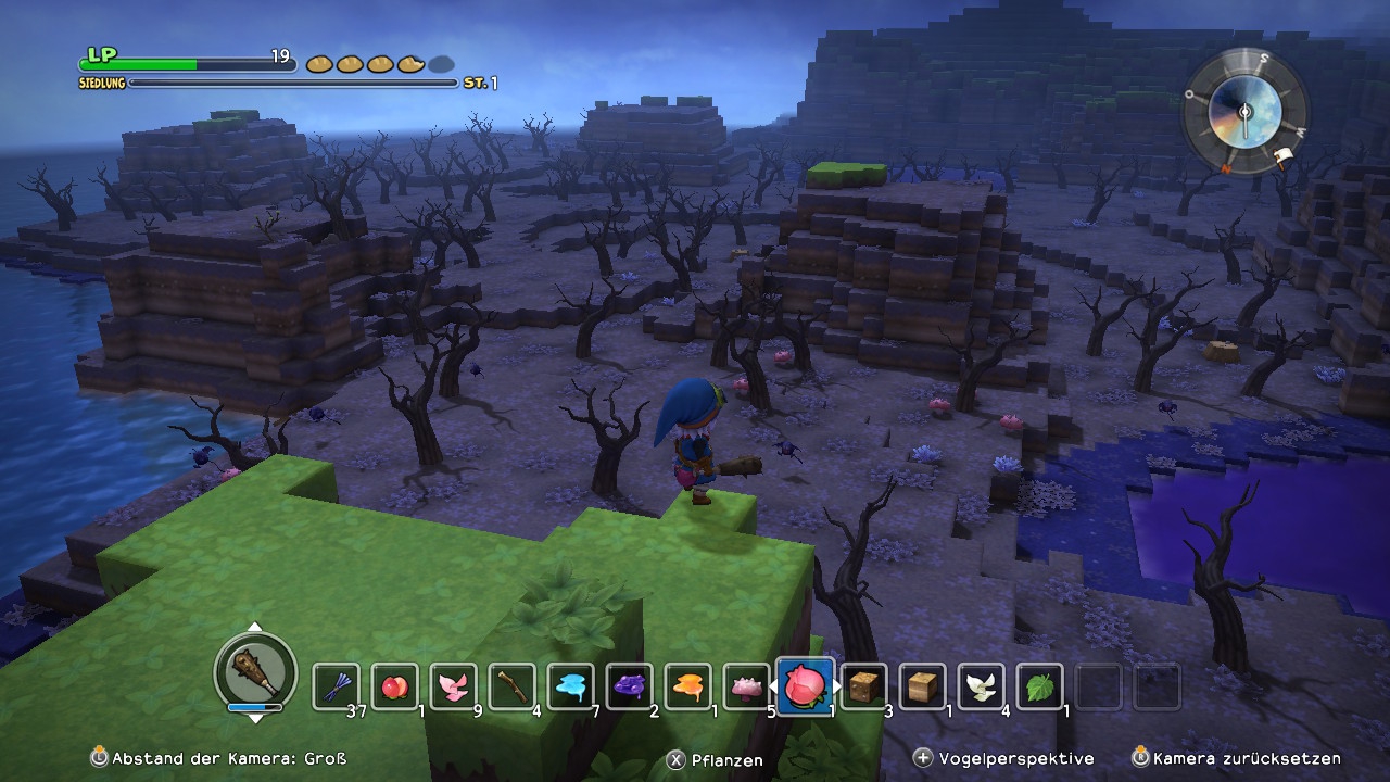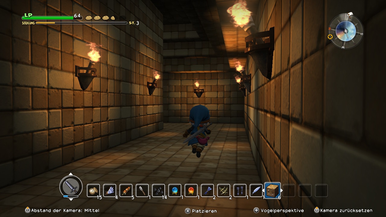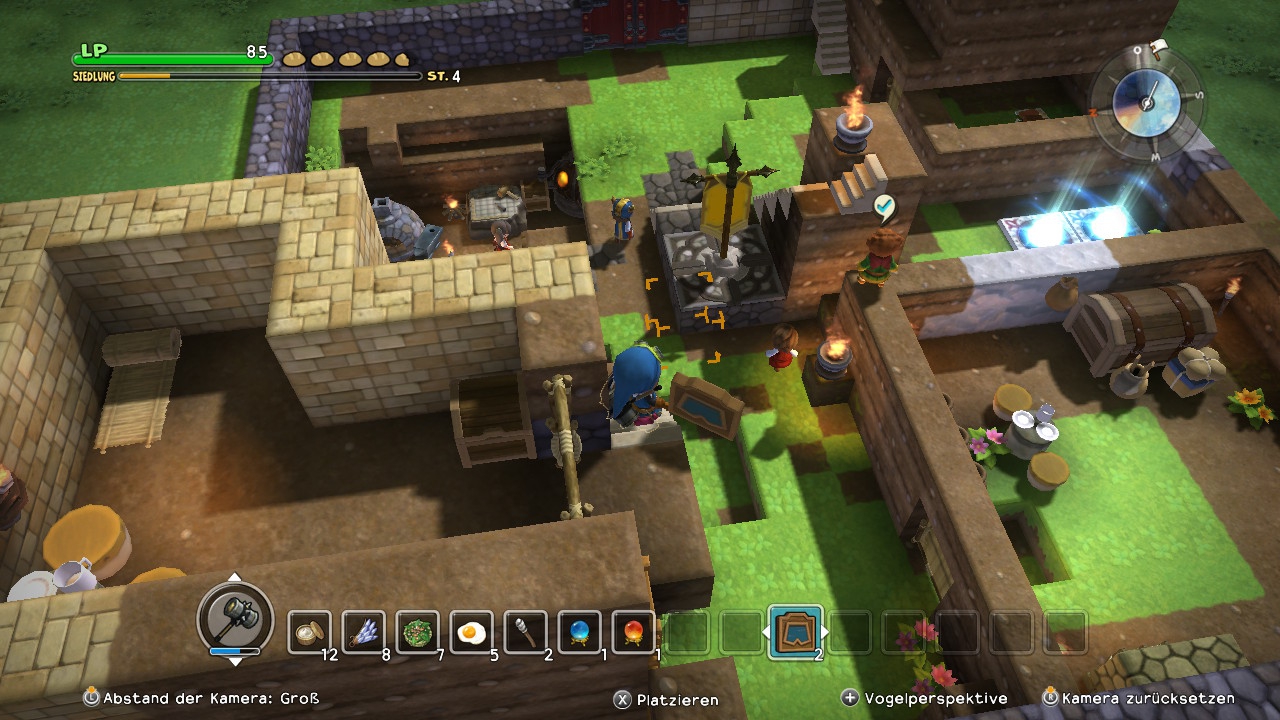 In diesem Punkt macht sich direkt der erste, große Unterschied zum Vorbild Minecraft bemerkbar: Dragon Quest Builders gibt euch deutliche Ziele vor und möchte zudem eine Geschichte erzählen – auch wenn diese sich insgesamt auf einem seichten, wenngleich dank charmanter Dialoge unterhaltsamen Niveau hält. Die Aufgaben wiederum eignen sich wunderbar für Einsteiger im Aufbau-Metier, führen sie diese doch schrittweise an die vielfältigen Baumöglichkeiten des Spiels heran. So möchte unsere erste Anwohnerin von Neu-Cantlin beispielsweise zunächst eine Unterkunft, die nach festen Regeln aufzubauen ist, damit sie vom Spiel auch als solche erkannt wird. Zwei Blöcke hohe Wände, ein Bett, eine Lichtquelle und eine Tür müssen rein und schon ist ein einfaches Zimmer gebaut! Dächer sind in Dragon Quest Builders optional, das aber wohl auch aus gutem Grund: In Ermangelung einer richtigen Ego-Perspektive spielt die Kamera in engen Räumlichkeiten leider eher widerwillig mit. So gibt es zwar eine spezielle Zoomstufe, die sich in geschlossenen Kammern einschalten lässt und der Sicht aus den Augen der Spielfigur sehr nahe kommt, die Charaktersteuerunge erfolgt jedoch weiterhin nach dem Muster der Verfolger-Perspektive. Das erschwert leider das Platzieren von Objekten in solchen Zimmern. Auch sollte man darauf achten, die Decke etwas höher anzusetzen, als es für den Minimalraum notwendig ist, denn nur zu gerne bleiben NPCs zwischen benutzten Objekten und dem Dach hängen.