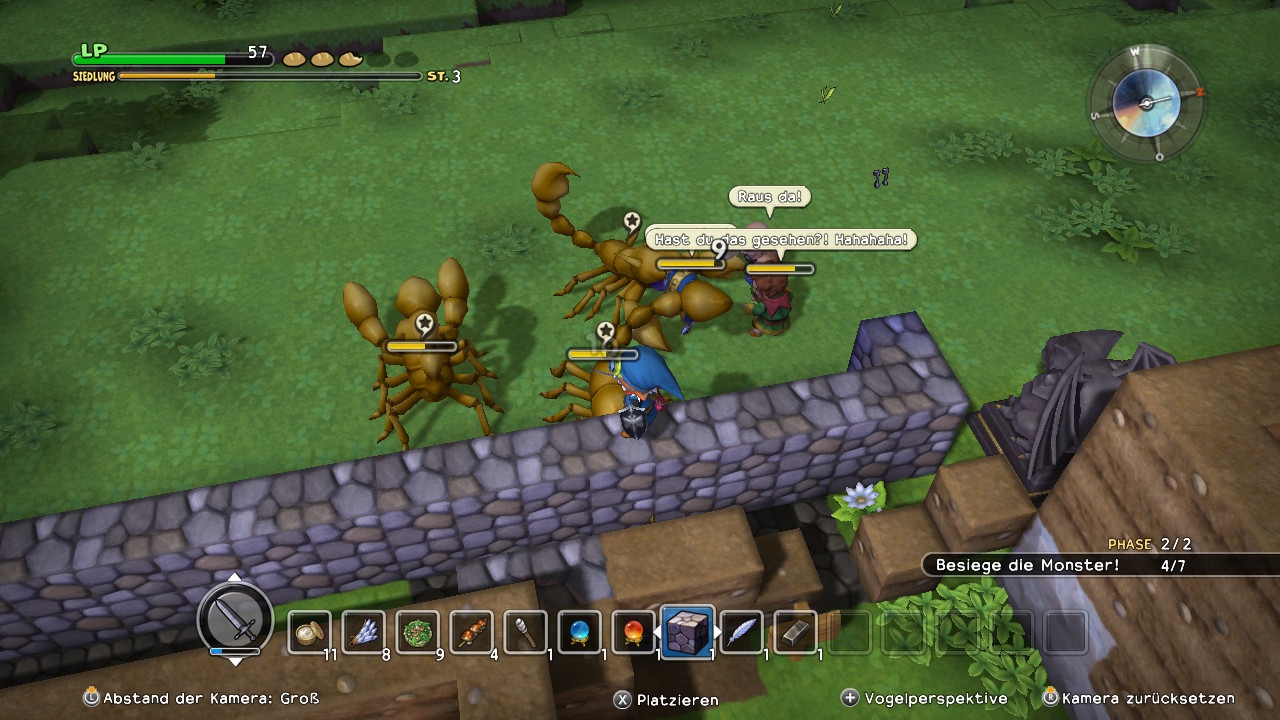 Ein nicht zu unterschätzender Aspekt in dieser von Monstern dominierten Welt ist natürlich auch der Kampf, der leider nicht zu den Stärken von Dragon Quest Builders gehört. Ein recht simples Action-Kampfsystem mit einfachen Hiebkombos und einer Hand voll erstellbaren Werkzeugen steht euch zur Verfügung, die Auseinandersetzungen mit den bunten Dragon Quest-Kreaturen fühlen sich die meiste Zeit jedoch eher nach eintöniger Fleißarbeit an. Das ist bei umgehbaren Normalo-Monstern eher weniger das Problem, doch größere Brocken und natürlich auch die gelegentlichen Bosse setzen voraus, dass ihr gut gerüstet an sie herangeht. Ein wenig aus dem Rahmen fallen hierbei die Kapitel-Endbosse, die mehr Puzzlecharakter haben, allerdings auch nicht wirklich beeindrucken. Dass die kleineren Unholde in unregelmäßigen Abständen und auch an Geschichts-Wendepunkten mal eure Siedlung zu überrennen versuchen, nervt leider ebenfalls ungemein, doch für diese Zwecke bietet euch Dragon Quest Builders immerhin reichhaltige Verteidigungsanlagen, mit denen ihr eure Schützlinge vor Schaden bewahren könnt – wenn sie nicht sogar selbst zur Waffe greifen und fleißig mithelfen