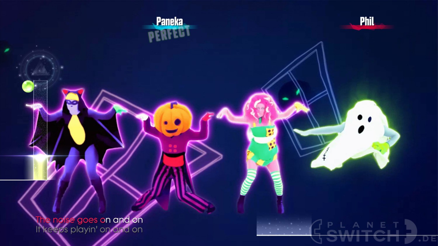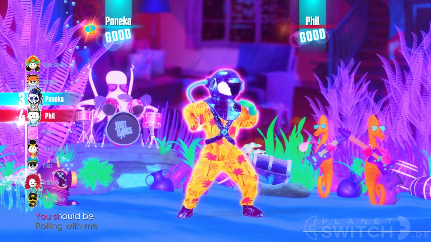 Kommen wir zum Herzstück eines solch bewegungsintensiven Spiels: der Steuerung. Im Gegensatz zu den anderen Versionen für PlayStation- oder Xbox-Systeme basiert die Switch-Version nicht auf Kameratechniken wie Kinect oder Playstation Move. Stattdessen läuft die gesamte Bewegungserkennung über die in den Joy-Cons eingebauten Sensoren ab. Diese erkennen Parameter wie Neigung, Drehung, Geschwindigkeit und viele mehr. Das klappt zumeist sehr gut, wohl aber nicht perfekt. Teilweise machten ich und meine Koop-Aushilfe nämlich haargenau die angezeigten Bewegungen nach, wurden aber mit einem dicken X oder einem „gut“ abgestraft. Auch das Gegenteil kommt öfters vor: So fuchtelten wir oft aufgrund von Reizüberflutung nur wild herum, sahnten jedoch ein „Perfekt“ nach dem anderen ab. Die meiste Zeit über hat man aber dennoch das Gefühl, dass alles recht gut bei der Hardware ankommt. Somit tun die kleineren Patzer in der Erkennung dem Spielspaß keinen Abbruch. Auch die Steuerung in den Menüs könnte eingängiger nicht sein, da man den Joy-Con senkrecht mit zum Körper gerichteten Schultertasten hält. Per Analogstick manövriert man sich durch die Menüs, bestätigt mit A, und geht mit B ein Menü zurück. Das ist analog dazu auch alles auf dem Joy-Con mit den Richtungstasten möglich, die Bildschirmbeschriftung wird dazu dann sogar angepasst. Alternativ darf man mit der passenden App für iOS und Android sogar sein Smartphone als Controller hernehmen, sollten doch mal die Joy-Cons ausgehen. Immerhin dürfen lokal bis zu sechs Personen gleichzeitig tanzen, wie auch immer das platztechnisch realisierbar sein soll…