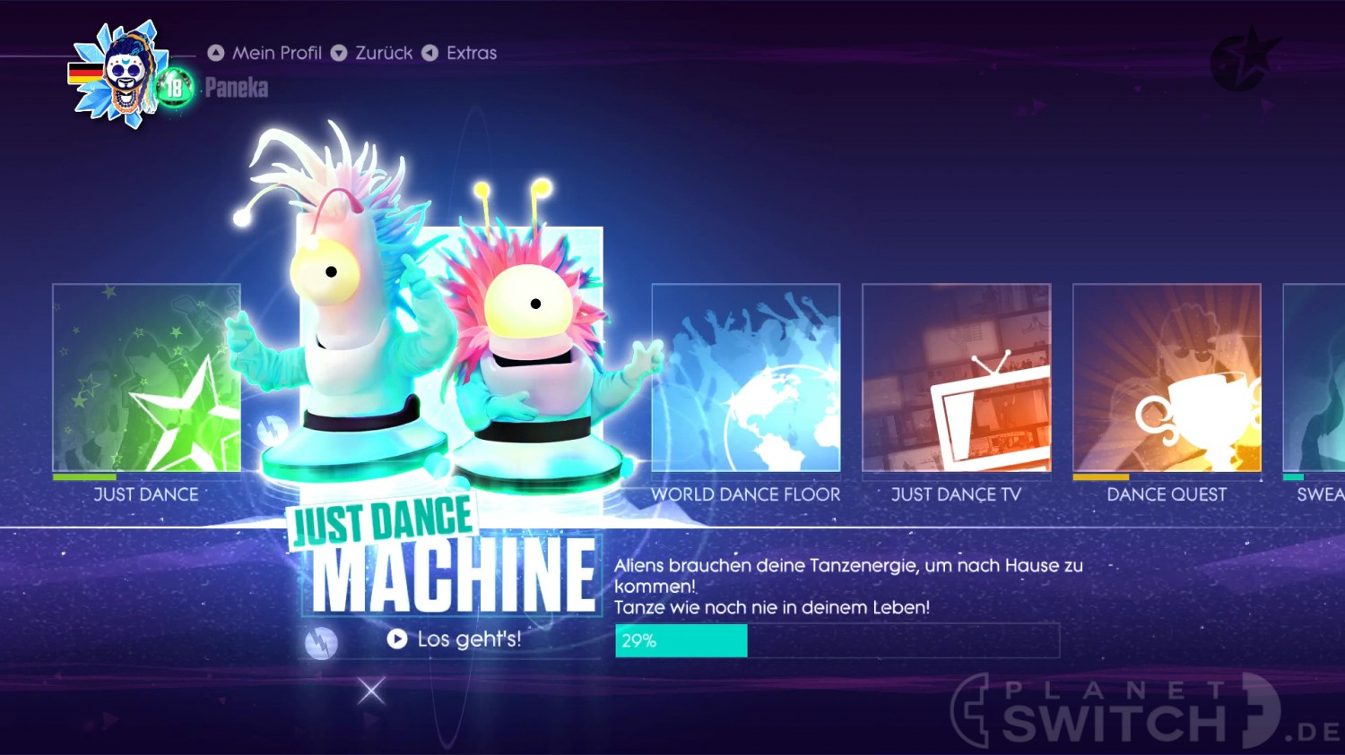 An Spielmodi mangelt es dem Spiel gewiss nicht. Im regulären Just Dance-Modus spielt man ganz normale Titel allein oder mit Spielpartnern und versucht dabei, die höchstmögliche Wertung zu erzielen. Der Modus „Dance Quest“ hingegen fasst diverse Mixes aus stets drei Songs eines bestimmten Themas zusammen. Pro getanzten Titel erhält man eine Wertung á la Mario Kart und landet man am Ende auf dem Treppchen, gibt es dem Schwierigkeitsgrad entsprechend zur Belohnung einen Pokal. Außerdem spielt man so nach und nach neue Dance Quests frei. Etwas sportlicher orientiert ist der Modus „Sweat + Playlist“, in der man sich in eigens erstellten oder frei mischbaren Playlists von drei, sechs oder zehn Tracks versucht. Der Clou: Jeder Titel hat, je nach Anspruch, einen gewissen Kalorienwert, den man bei fachgerechter Ausführung verbrennt. Wissenschaftliche Genauigkeit darf man dabei natürlich nicht erwarten, einen gewissen motivierenden Faktor möchte ich dem Ganzen aber nicht absprechen. Für den Einzeltänzer hingegen eignet sich der neue Spielmodus „Just Dance Machine“. Dort verirren sich zwei Aliens mit ihrem UFO auf unserem Planeten Erde und brauchen neuen Saft, um wieder nach Hause fliegen zu können. Was macht man also? Klar, man entführt ein paar Menschen und lässt sie tanzen. In den eher kürzeren, dafür aber sehr vielseitigen Tanzeinlagen erzeugt man so wertvolle Tanzenergie, welche am Ende ins Bordsystem eingespeist wird.