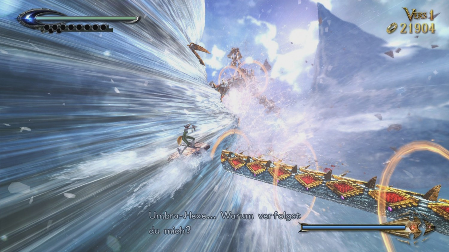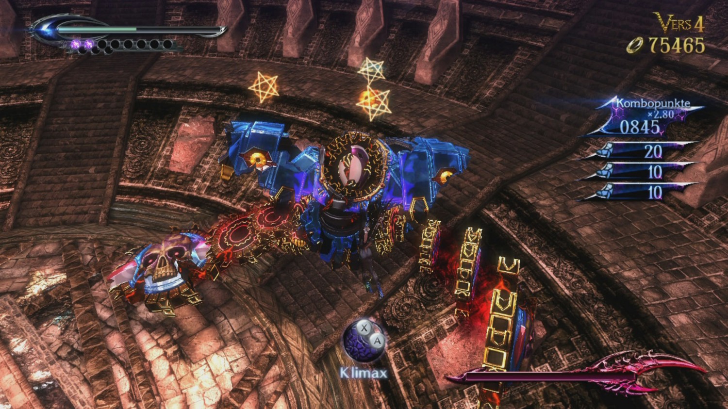 Dennoch ist die Hexenzeit nicht geschenkt und ständig den rechten Trigger zum Ausweichen drücken ist auch nicht der optimale Weg. Es ist sinnvoller, tatsächlich auf die Gegner zu achten und im richtigen Moment zu handeln. Gerade weil diese Mechanik so ordentlich umgesetzt wurde und die Steuerung konsequent ist, kann man in den Kämpfen nicht dem Spiel die Schuld geben wenn mal wieder „Die Hexenjagd ist beendet“ auf dem Bildschirm steht. Jedes Kapitel bietet dann noch mindestens einen größeren Bosskampf. In den meisten anderen Spielen wäre man wohl eingeschüchtert, wenn man hochhausgroße Monster mit bloßen Fäusten zerstören sollte. Nicht aber wenn man mit Bayonetta antritt. Das Highlight in Bosskämpfen sind immer die Finisher welche sich „Klimax“ nennen. Dabei beschwört Bayonetta einen von zahlreichen Dämonen aus der Hölle, welche dem Boss mit Kräften im hundertfachen Gigatonnen-Bereich den Rest geben. Manche Kapitel bestehen in ihrem Großteil sogar nur aus riesigen Bosskämpfen, wodurch sie sich im geheimen ganz gut zum Sammeln von Heiligenscheinen eignen.