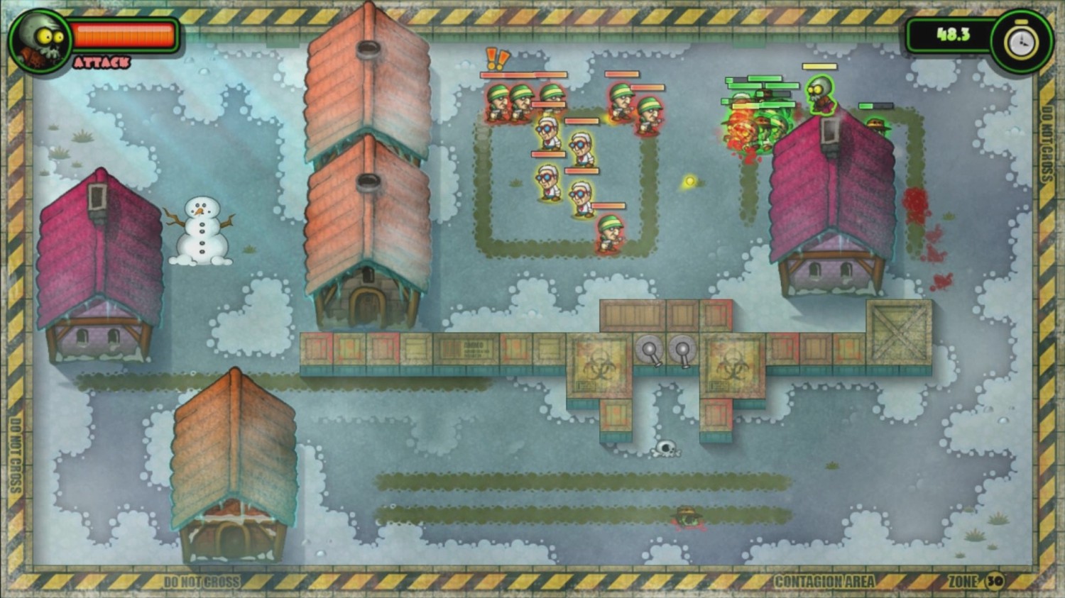Im Spiel selbst steuer ich den bereits genannten Oberzombie, den ich in jedem Level durch ein rechteckiges Gebiet bewege, das durch verschiedene Gebäude und Kisten begrenzt wird. Ziel jedes der 30 Level ist, alle normalen Menschen und Soldaten oder eine spezielle Figur zu zombifizieren. Das geschieht, indem ich mich einfach dicht an die Person annähere. Natürlich bemerken die Menschen meine Anwesenheit und rennen entweder kreischend davon (Zivilisten) oder beschießen mich mit ihren Waffen (Soldaten). Da leider auch ein Zombie irgendwann tot ist, halte ich nur begrenzt Dauerfeuer aus, um auch das Militär zu verspeisen. Jede Stufe stellt mich damit immer wieder vor die Herausforderung spezielle Laufwege der schwer bewaffneten Soldaten abzupassen um erst die Zivilisten auf meine Seite zu ziehen und um dann mit einer kleinen Armee an Hirnlosen auch die mit den Waffen zu verspeisen. Dabei kann ich meine Gefolgsleute mit den Befehlen Angriff, Folgen und Warten, die auf den rechten Aktionsbuttons gelegt sind, steuern. Der X-Button setzt das Level dagegen sofort zurück.