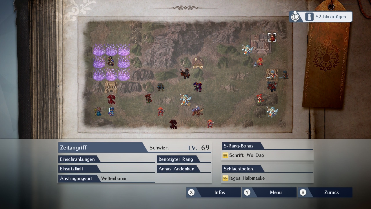 Im unten einsehbaren Video sprach ich noch davon, dass es für die ach so nützlichen Skills dank des generell eher niedrigen Missionsanspruchs kaum Verwendungszwecke gebe, doch das Team von Omega-Force hat hier augenscheinlich nachgebessert. Die drei neuen Karten für den Historischen Modus - „Prinzessin Minerva“, „Teufelsgebirge“ und „Markt von Knorda“ – fangen nur bewusst einfach an, um euch schnell Zugriff auf die Meistersiegel zu geben. Danach steigt die Levelempfehlung gnadenlos an, bis es zur finalen Handlungsschlacht auf Stufe 85 zur Sache geht. Die danach freigeschalteten Raum-Zeit-Verzerrungen durchbrechen sogar die 100er-Marke! Zum Vergleich: Die schwierigsten Missionen des Kernspiels hörten bereits auf Level 80 auf. Entsprechend gut solltet ihr also auch gewappnet sein, wenn ihr euch den Kämpfen stellen möchtet. Andernfalls dauern die Gefechte qualvoll lang, was nicht zuletzt auch am äußerst liberalen Einsatz der sehr stabil gebauten Schatten-Charaktere liegt.