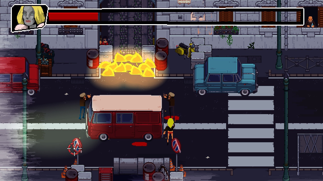 Bei den eigentlichen Schießereien ist hingegen volle Aufmerksamkeit gefordert. Ihr leitet Piero mit dem linken Stick aus der Vogelperspektive durch die pixeligen Landschaften, während die rechte Analog-Einheit für das jederzeit sichtbare Fadenkreuz genutzt wird. Letzteres dient nicht nur zur Kamera-Steuerung, sondern natürlich auch zum Ausrichten von Pieros Knarre. In kompakten Umgebungen nehmt ihr auf diese Weise kleinere Gegnerwellen aufs Korn und schaltet sie gezielt aus – entweder mit direkten Treffern oder über Trickschüsse, die zuvor an Verkehrschildern abgeprallt sind. Manche Situationen lassen sich durch vorsichtiges Vorgehen und Erdrosseln der feindlichen Gauner auch eleganter lösen, in wenigen Situationen wird man sogar zum Schleichen gezwungen. Wer jedoch Geduld mitbringt und die Gegnerpositionen sowie andere gemeine Fallen lernt, kann die meisten Szenen knallig zu einem Abschluss bringen.