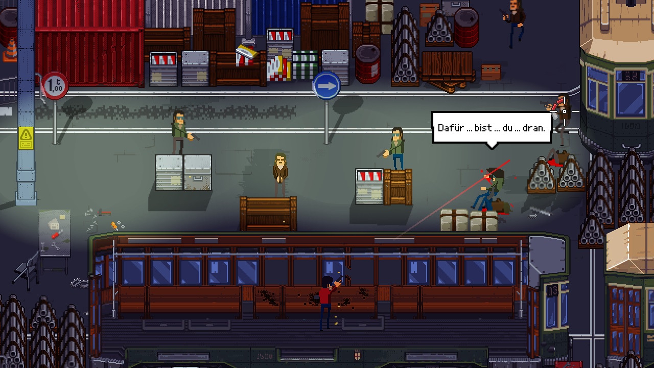 Milanoir verlangt starke Nerven. Sonderlich leicht ist dieser Action-Titel nämlich keineswegs. Das einerseits aus gewollten Gründen wie den fordernden Feindkonstellationen sowie diversen Umgebungsobjekten, die euch gerne mal auf die ein oder andere Weise übel mitspielen möchten. Und die trotzt augenzwinkernder 70er-Jahre-Aufmachung ziemlich ernste Rahmenhandlung ist ebenfalls nichts für zartbesaitete Naturen. Es wirken jedoch auch andere Faktoren auf den Härtegrad ein, die das Spiel künstlich schwerer machen. Theoretisch erlaubt das freie Fadenkreuzzielen mit eingeschalteter Hilfe akkuratere Schüsse, als es die klassische Twin-Stick-Vairante ermöglichen würde, praktisch seid ihr damit jedoch aufgeschmissen, wenn euch mehrere Feinde in die Zange nehmen. Das Ausschalten der Zielautomatik hilft hierbei auch nur bedingt. Dass dann auch noch lediglich zwischen den an und für sich glücklicherweise eher kompakten Kapiteln gespeichert wird, nagt ebenfalls an der Motivation. Checkpoints bietet Milanoir nach jedem Bildschirmübergang, wollt ihr jedoch Pause machen und beendet das Spiel inmitten einer Episode, müsst ihr sie beim nächsten Anlauf komplett von vorn beginnen. Nichtsdestotrotz: Wenn euch der Sinn nach beinharter Action-Kost steht, macht ihr mit diesem pixeligen Gangster-Drama nicht viel verkehrt.