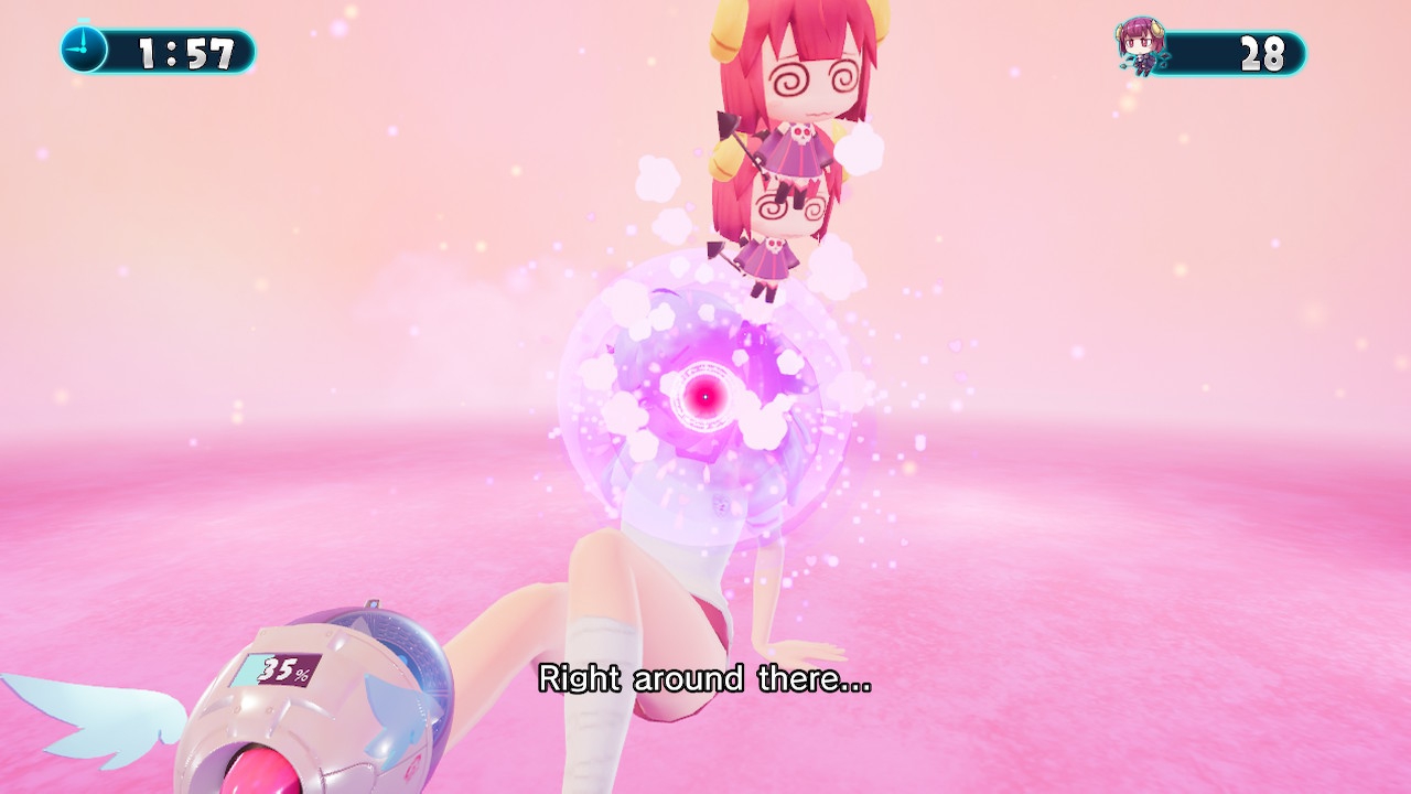 Nicht zuletzt deswegen, weil Gal Gun 2 mit seinen bereits erwähnten, unterschiedlichen Enden zu mehreren Anläufen anregt und solche Wiederholungen entsprechend nervig ausfallen. Die Weichen für die Abschluss-Szenarien legt ihr dadurch, wie ihr euch mit den einzigen beiden Mädels des Spiels anfreundet, die von der VR-Brille nicht beeinträchtigt zu sein scheinen. Ob ihr euch nun der Kindheitsfrendin Nanako widmet oder mit der zurückgezogen lebende Nachbarin Chiru anbändelt, ist dabei euch überlassen. In beiden Fällen müsst ihr sie jedoch erst mit reichlich Süßkram überzeugen und anschließend eine Hand voll spezifischer Missionen erfüllen, die ihre jeweiligen Geschichten vorantreiben. Ähnlich wie bei der Punktehatz gilt: Allzu stressig fällt dies nicht aus, man kann locker die Zuneigung beider Charaktere innerhalb des Zeitlimits maximieren. Hierbei werdet ihr auch sehr früh mit kleinen Minigames bekannt gemacht, die gerne mal auf eher schlüpfrige Situationen anspielen.
