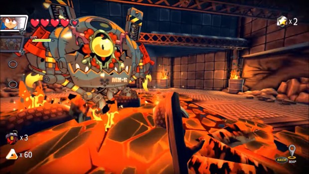 Am Anfang ist man noch sehr wenig ausgerüstet – einzig und allein ein Stöckchen hat man zur Verteidigung. In den dreidimensionalen Arealen lauern dabei diverse Gegner auf einem, die jedoch allesamt zweidimensional animiert sind. Das mag etwas merkwürdig klingen, aber ich muss sagen dass die Optik vermutlich einer der besten Aspekte ist. Während sich die grundsätzliche Umgebung im sattem Cel-Shading-Look präsentiert, sehen die Figuren im Spiel aus, als wären sie einem Comic entsprungen und sind dabei sogar noch echt gut animiert. Das gleiche gilt für die Spezialeffekte sobald man mal die Gelegenheit hat bekommt, Feuerbälle oder ähnliches zu schmeißen, die bei Auftreffen auf dem Boden oder Gegner sehr zufriedenstellend explodieren. Hut ab, das sieht jetzt schon echt gut aus.