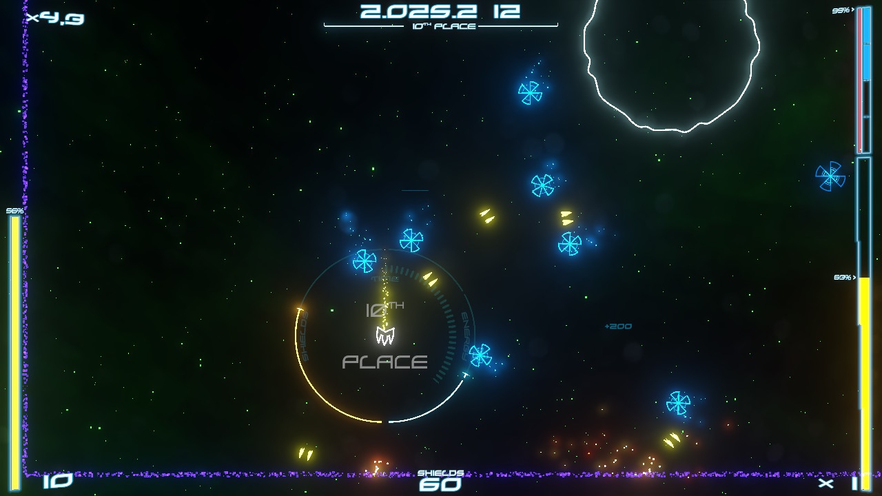Einmal in der Arena angekommen, fühlt man sich als Geometry Wars-Veteran direkt daheim. Mit dem linken Stick wird der kleine Raumgleiter durch das rechteckige Feld gelenkt, während der rechte Stick zum Feuern der Bordgeschütze dient. Für den kleinen Notfall zwischendurch lässt sich auch Knopfdruck zudem das Geschehen verlangsamen oder mit einer Bombe der ganze Bildschirm leerfegen, um haarigeren Situationen zu entkommen – beide Spezialaktionen benötigen allerdings gesonderte Energie, die sich nur langsam regeneriert. Mit diesen simplen Mitteln arbeitet man dann an seinem Highscore, der primär durch möglichst hohe Abschuss-Kombos in die Höhe getrieben wird. Bei einer Kette von 300 zerstörten Feinden schießt die Punktzahl schon mal regelrecht durch die Decke! Die stetig kniffliger werdenden Gegnerformationen sorgen jedoch dafür, dass dieses Vorhaben alles andere als einfach wird. Das liegt leider zum Teil auch daran, dass bestimmte Gegner wie die omnipräsenten cyanblauen Formen nur zu gerne aus dem Nichts erscheinen und euch so hinterrücks die Schild-Energie rauben. Andere unliebsame Konstrukte kündigen sich deutlich durchschaubarer an, was angesichts des schieren Effektgewitters auch bitter nötig ist.