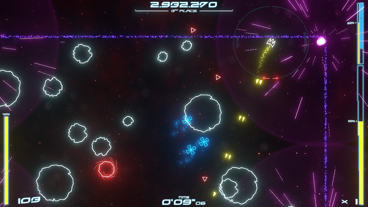 Debris Infinity bietet euch drei Spielmodi. So könnt ihr euch etwa an einer ganz klassischen Überlebensrunde versuchen und nach vorgegebenen Muster eingewechselte Gegner vom Feld fegen, innerhalb eines bestimmten Gesamt-Zeitlimits die höchste Punktzahl einfahren oder im Power-Modus zufällig arrangierte Gegnerwellen unter einer etappenweise ausgerichteten Zeitbeschränkung ausschalten. Das klingt nach recht wenig und ist es im Prinzip irgendwie auch, doch was hier ist, macht auf jeden Fall Laune. Während man im Klassik-Modus mit jedem Anlauf an seiner Strategie feilt und den Kombo-Zähler in die Höhe treibt, steht bei Power-Runden der reine Adrenalin-Schub auf dem Programm, wenn man es mal wieder mit einer unliebsamen Feindformation zu tun hat und nur wenig Zeit bis zum Abschluss der Etappe übrig ist.