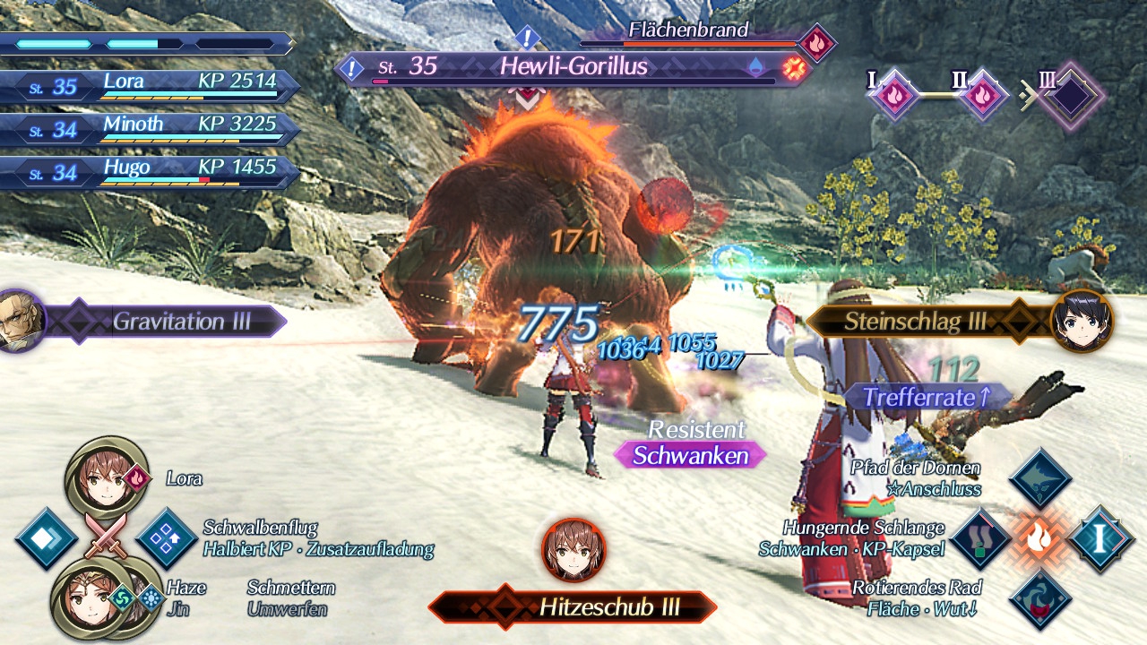 Dieser Umstand enttäuschte mich umso mehr, da die Erweiterung bis dahin ein vergleichsweise gutes Tempo vorlag. Dauerte es im Hauptteil noch ewig, bis man eine anständige Kampftruppe zur Erkundung der Areale zur Verfügung hatte, führt euch The Golden Country sehr schnell an die Möglichkeiten im Kampf heran und stellt euch flott alle nötigen Werkzeuge bereit. Das mag auch an den allgemeinen Anpassungen im Kampfsystem liegen. Statt wie zuvor bis zu drei Meister ins Gefecht zu schicken, die wiederum von bis zu drei auswählbaren Klingenpartnern gestärkt werden können, bekommt ihr es hier mit fest zugeteilten Dreierteams zu tun, von denen je zwei Mitglieder als aktiver und unterstützender Kämpfer im Ring stehen. Und ja, die sonst als Supporter dienenden Klingen werden hier auch handgreiflich: Auf Knopfdruck wechseln sie mit ihrem Meister die Führungsposition, damit ihr sie direkt im Kampf steuern und auf ihre jeweiligen Fähigkeiten zugreifen könnt. Dieses Wechselspiel wird ferner dadurch belohnt, dass die Abklingzeiten der Skills eingewechselter Einheiten entfallen und deren Techniken somit sofort einsetzbar sind. Nicht zuletzt werden rot markierte Bereiche des HP-Balkens beim Abklatschen direkt regeneriert. Auf diese Weise gewinnt das zu Beginn äußerst träge Kampfsystem enorm an Dynamik, was ungemein Laune macht. Schade nur, dass die Gegner natürlich abermals reichlich einstecken können und so manches Gefecht gegen Normalo-Feinde sich länger streckt, als man bei einem Stufenunterschied von fünf oder höher erwartet. Manche Altlasten wird Xenoblade 2 einfach nicht los, auch wenn dies fairerweise dem Fokus auf Skill-Kombos und damit verbundene Schadensmodifikatoren verschuldet ist.