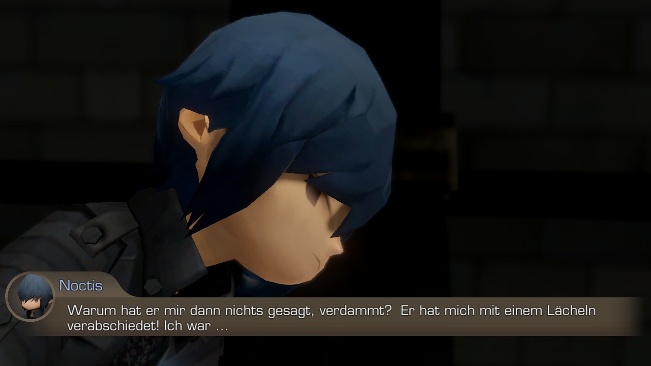 Da die Pocket Edition eigentlich für Smartphones gedacht war, bleibt von der einstigen Grafik-Pracht des originalen Final Fantasy XVs natürlich nicht viel übrig. Stattdessen wurde das Spiel im Stile der DS-Remakes von Final Fantasy III und IV rekonstruiert, was aufgrund des extrem stilisierten, cartoonhaften Charakterdesigns zunächst höchst gewöhnungsbedürftig wirkt. Zwiebelkopf Noctis kommt dabei noch vergleichsweise glimpflich weg, Muskelprotz Gladiolus verfügt hingegen über eindeutig zu breite Schultern für seine Beine und der enigmatische Ardyn kann in seinem Aufzug seine schlussendliche Rolle kaum verheimlichen. Mit der Zeit nimmt man die Kopffüßler als solche jedoch kaum wahr – was nicht bedeutet, dass die Zwischensequenzen dadurch besser rüberkommen. Im Gegenteil: Weil den Figuren jegliche Gesichtsanimationen fehlen, zünden dramatische Momente nur selten. Besonders beispielhaft ist eine Szene, in der Noctis eigentlich bedrückt ist, sein kindliches Charakter-Modell in dieser Szene jedoch ein deutliches Lächeln zeigt. Somit passen die Animationen auch nur selten zur Tonspur, die vollständig aus dem großen Original entnommen ist – löblicherweise sowohl in der japanischen Sprachfassung als auch der englischen, französischen oder deutschen. Letztere ist dabei übrigens an sich gar nicht mal so übel, wenn man gewisse Aussetzer ignoriert. Mir ist die Truppe dank der verspielten Kommentare auf ihrer Reise schon auf der PS4 in Windeseile ans Herz gewachsen und auch in der Pocket Edition kommen zumindest ihre Persönlichkeiten gut rüber. Und wo die Sprachausgabe drin ist, darf natürlich nicht der famose Soundtrack fehlen. Der ist ebenfalls beinahe komplett übernommen wurden und sorgt für die passende, musikalische Begleitung bei allen wichtigen Momenten des Abenteuers. Einen letzten, technischen Wermutstropfen habe ich dennoch: Trotz der reduzierten Optik läuft das Spiel leider nicht durchgehend flüssig und neigt beispielsweise in Altissia oder während heftigerer Kämpfe zu kleineren Framerate-Einbrüchen. Außerdem sind die Ladezeiten nicht von schlechten Eltern – stellt euch bei jedem Szenenwechsel also erst einmal auf eine kleine Zwangspause ein.