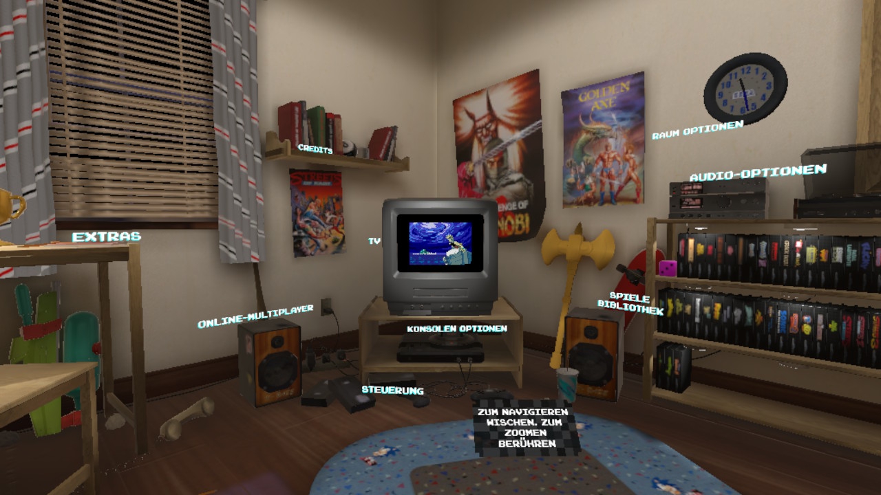 Das als Zocker-Zimmer aufgezogene Hauptmenü mit einem niedlichen Röhrenfernseher im Zentrum hat dabei schon mal Stil, offenbart jedoch auch schnell einige Schwächen. So könnt ihr mit dem Analogstick auch im reingezoomten Zustand zu anderen Menüpunkten springen, was jedoch auch dazu führt, dass im als Spieleregal visualisierten Game-Auswahlmenü nicht automatisch in die nächste Zeile gesprungen wird, sobald ihr am Ende der vorherigen angelangt. Stellenweise fehlende deutsche Übersetzungen in den Menüs fallen ebenfalls negativ auf. Klar sind das vergleichsweise Kleinigkeiten, doch da man augenscheinlich etwas Wert auf die Aufmachung gelegt hat, sollte die natürlich dann auch sauber funktionieren. Immerhin können Lieblingstitel markiert und ganz an den Anfang der Liste verschoben werden, um sie einfacher herauszupicken.