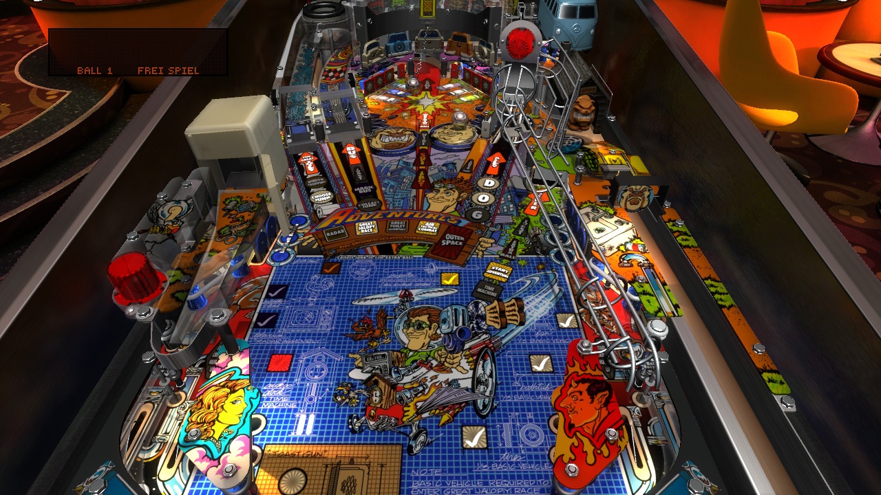 Der vermutlich schwächste Tisch des Trios dürfte wohl Junk Yard sein, wobei dies keineswegs bedeuten soll, dass der Flipper schlecht sei. Hier geht es darum, dass man auf einem Schrottplatz eingepfercht wurde und nun wieder raus will – und dazu baut man sich aus herumliegendem Müll allerlei wilde Gerätschaften, mit deren Hilfe es schlussendlich ins All geht. Das Konzept allein ist schon herrlich Banane, die Umsetzung jedoch erstaunlich simpel. So lassen sich die notwendigen Gerätschaften über relativ einfache Missionen erbeuten, die wiederum größere und lukrativere Abenteuer-Modi freischalten. Dann muss man schon mal mit seiner Badewannen-Karre Kontrollpunkte abfahren, indem man gewisse Rampen auf dem Tisch abgeht. Auch nett: Hat man die Zeitmaschine freigeschaltet, spielt man einen zufälligen Modus von ausgewählten anderen Williams- und Bally-Tischen wie beispielsweise die UFO-Jagd von Attack from Mars. Dadurch kommt eine gewisse Portion Wahnwitz ins Spielerlebnis, die auf jeden Fall fesselt.