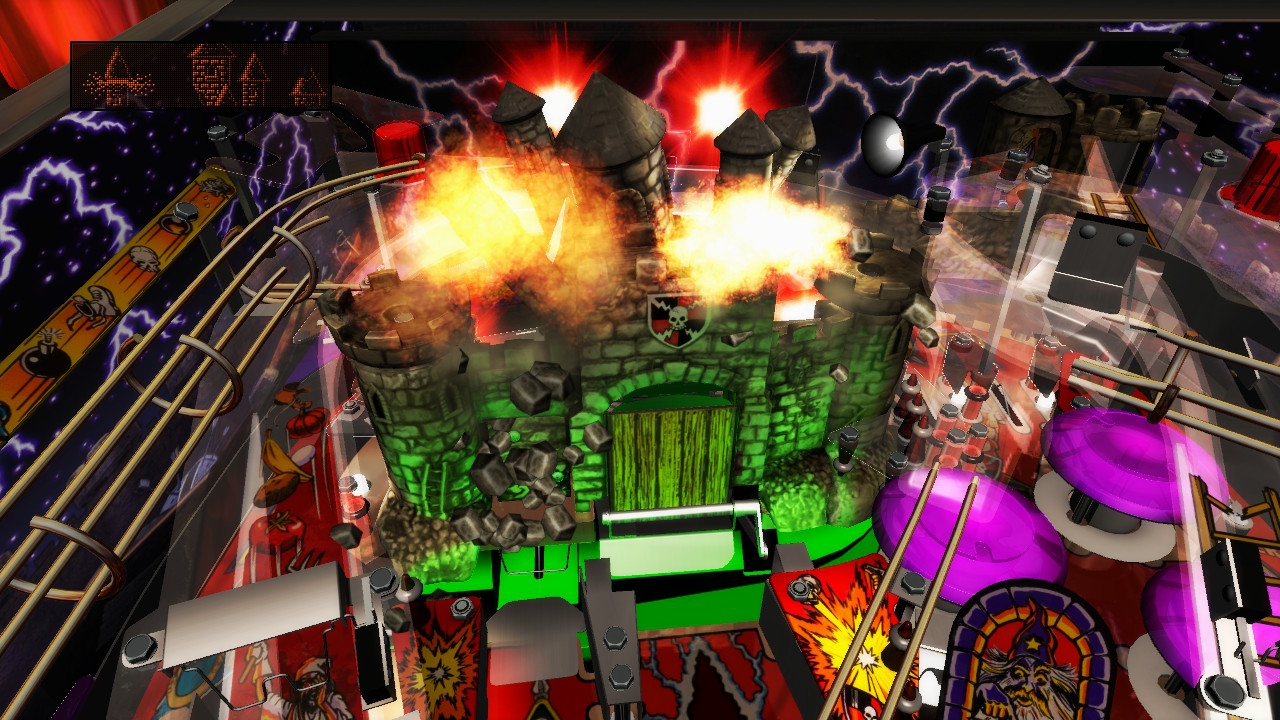Nur ein bisschen weniger verrückt geht es bei Medieval Madness zu Gange. Hauptziel an diesem Tisch: Den King of Payne stürzen! Wie tut man das? Indem man die ihm und seinem Gefolge unterstehenden Burgen erobert! Also arbeitet ihr euch systematisch durch die imaginäre Fantasy-Landschaft und stürmt die am oberen Spielfeldrand ersichtliche Festung. Ein paar Klopfer, um die Zugbrücke herunterzulassen und das Tor zu öffnen, nur um dann mit einem gezielten Schuss das motorisierte Schloss-Modell zum Zittern und Stürzen zu bringen. Auch digital ein zufriedenstellendes Erlebnis! Abseits des Hauptteils gibt es natürlich ebenfalls einiges zu erleben. So wollen im Football-Stil moderierte Ritterspiele gewonnen, Prinzessinen aus den Klauen von Drachen befreit und wütende Dörfler angestachelt werden. Die Meisterung dieser Modi ergänzt Modifikatoren zum großen Multiball-Madness-Modus, bei dem es entsprechend eurer vorherigen Leistungen Kugeln und Jackpots hagelt. Dadurch kommt ein enorm abwechslungsreiches und nicht selten urkomisches Spiel zustande, das dem Wahnsinnselement des Titels mehr als gerecht wird.