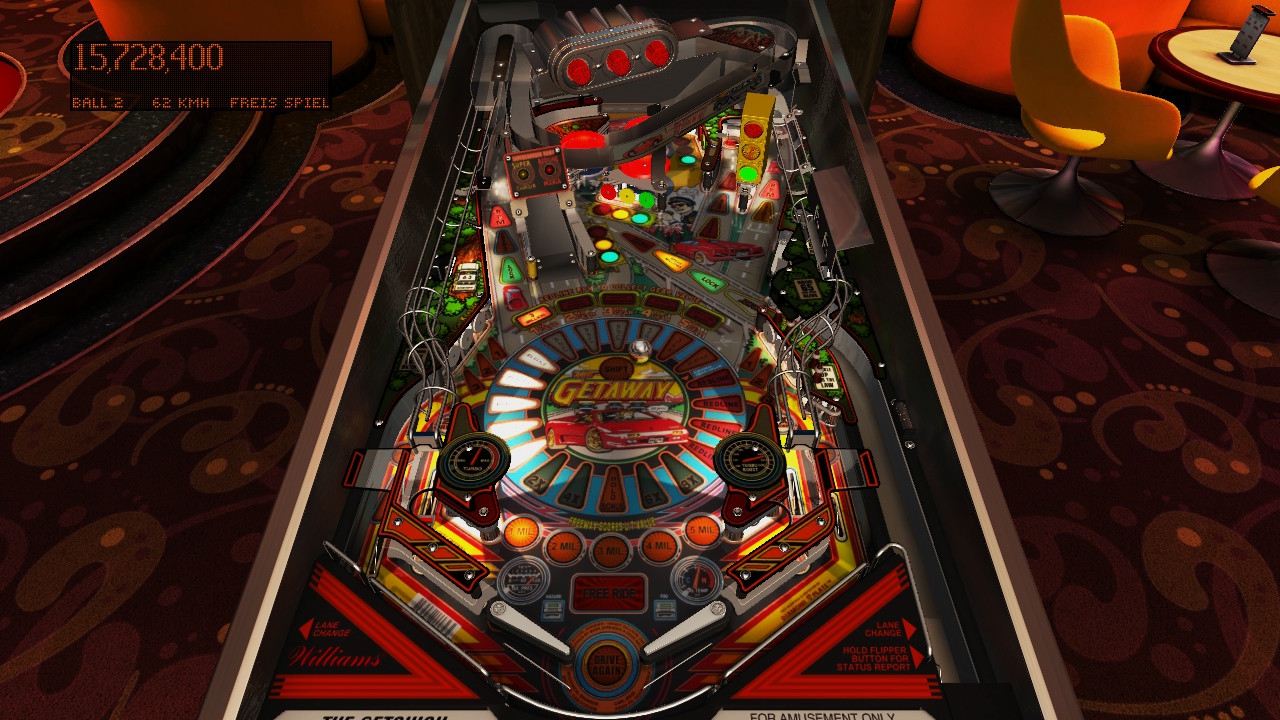 Wesentlich bodenständiger wird es dann beim letzten Teil des Pakets. The Getaway: High Speed II macht heiße Verfolgungsjagden mit Polizisten zum Thema und zu diesem Zweck muss zu Beginn erst einmal Tempo aufgebaut werden. Der äußere Orbit erhöht dabei die Drehzahl eures Flitzers und mit der Abschuss-Taste wird bei entsprechend hohem Wert geschaltet. Dann winken potenziell höhere Punktzahlen und natürlich auch Zugriff auf weitere Modi. All dies kulminiert dann im Duell mit dem Gesetz, wo ihr richtig Gummi geben und mit gezielten Flipper-Schlägen den Polizisten entkommen müsst – bei Erfolg hagelt es geradezu Punkte. Tempo ist das Kernelement von The Getaway und das macht sich auch beim Kugelverhalten bemerkbar. Nicht selten flitzt die Silbersphäre im Eiltempo über den Tisch und prallt an allen möglichen Zielen ab. Ein rundum schöner Flipper, der vor allem nach dem eher mäßigen V12 von Zen selbst einen ordentlichen Automaten mit Auto-Thema zum Pinball FX3-Sortiment hinzufügt.
