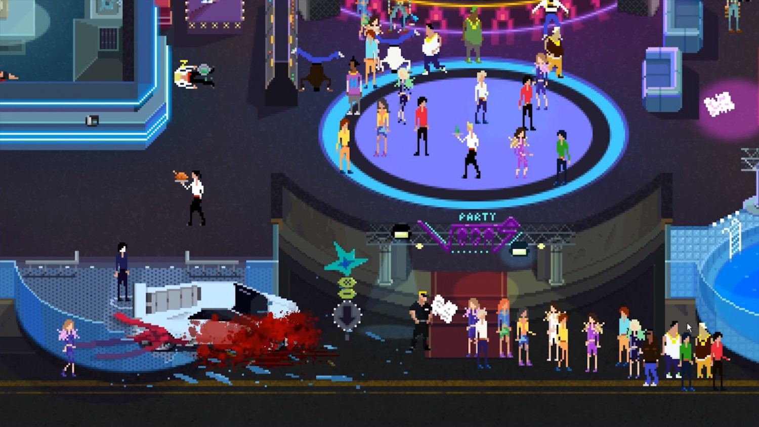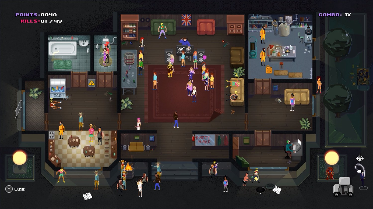 Der Schwierigkeitsgrad ist dabei aber so „hard“, dass ich beispielsweise schon im ersten Level an meinen Fähigkeiten zweifelte und nach unzähligen Festnahmen entnervt das Spiel zur Seite legte. Nach einer gewissen Eingewöhnung kommt man jedoch in den Flow und lernt immer mehr Kniffe kennen, die sich in späteren Szenarien auch gern mal wiederholen. So kann man neben dem üblichen Messerstich auch Pixelmenschen vom Dach oder in einen Ventilator stoßen, die Bowle oder Drinks vergiften, elektrische Geräte oder Fahrzeuge zum Explodieren bringen oder vor Trunkenheit schlafende Subjekte einfach auf die Straße legen. Den Rest erledigt die auch nicht ganz vorbildliche Ingame-Polizei und überrollt beim nächsten Einsatz die nichtahnenden Schnarchnasen.