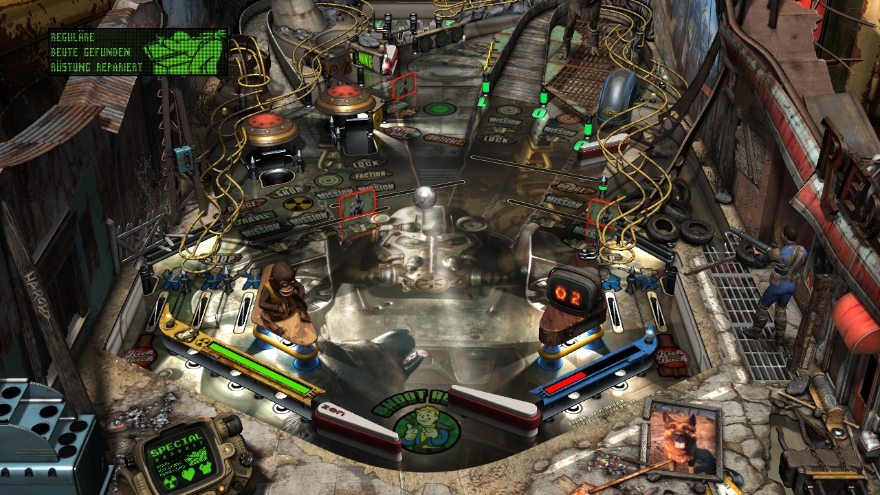 Den Anfang macht Fallout, basierend auf dem postapokalyptischen Rollenspielhit – allerdings auf keinem speziellen Teil. Der Prämisse zufolge wandert ihr schlichtweg durch die Ödnis, stellt einige Atomschutzbunker auf den Kopf und erfüllt Aufträge für unterschiedliche Fraktionen. Witzigerweise dürft ihr euren Charakter sogar nach dem SPECIAL-Attribut-System erstellen und aufleveln, diese Errungenschaften werden jedoch nicht partieübergreifend gespeichert. Dies führt unweigerlich dazu, dass man sich nach ein paar Runden schlichtweg zufällige Charaktere auswürfeln lässt, anstatt jedes Mal aufs neue alles haarklein anzupassen. Das bleibt zudem nicht die einzige Enttäuschung: Das Missionsdesign lässt arg zu wünschen übrig und präsentiert euch mit den immergleichen, zufälligen Bahnen, die es abzuschießen gilt, bevor ihr es mit ein paar Gegner-Fallzielen zu tun bekommt. Da hilft es auch nicht, dass ihr die Feinde mit gedrücktgehaltener Abschuss-Taste auch per V.A.T.S.-Zielfunktion ins Visier nehmen und für Bonus-Schaden abschießen könnt. Zusammen mit der postapokalyptisch zwar angemessenen, jedoch trotzdem irgendwie tristen Aufmachung bleibt hier leider nicht allzu viel hängen, weswegen der Tisch letztenendes nur netter Durchschnitt mit interessanten Ansätzen bleibt.