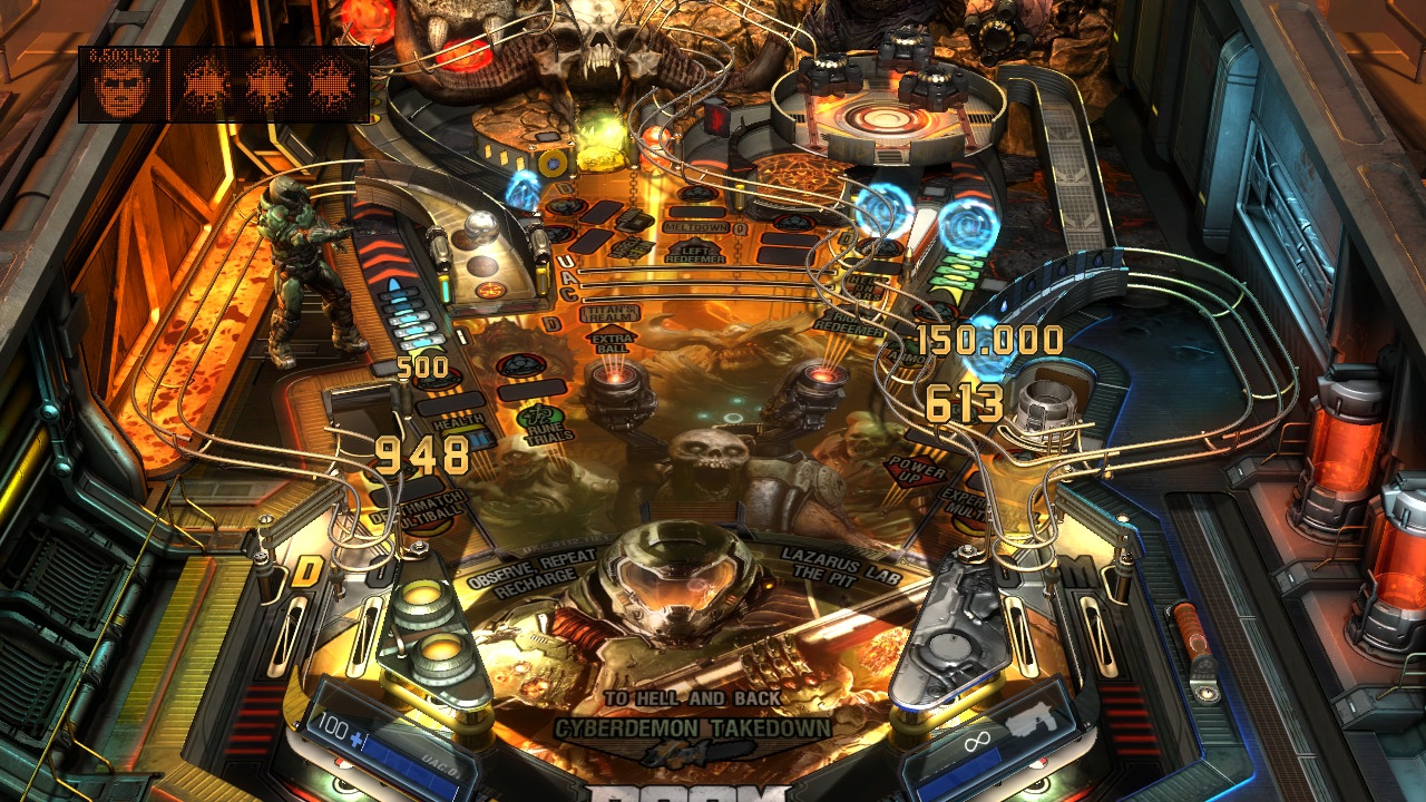 Doch auch für Freunde der gewöhnlichen Kugelschubserei hat Bethesda Pinball etwas am Start: Doom auf Basis der 2016er Neuinterpretation! Das Endgame lautet hier, den am oberen Tischrand befindlichen Cyber-Demon auszuschalten, doch dafür müssen erst einmal andere Mini-Aufgaben erfüllt werden. Die lassen sich recht unkompliziert aktivieren, dafür jedoch alles andere als einfach abschließen. Gefühlt dauern die meisten der Tisch-Missionen durch ihre schiere Anzahl an Zielen viel zu lang, was dem ansonsten recht flotten Flipper ironischerweise das Tempo nimmt. Abwechslung gibt es trotzdem reichlich: Egal ob ihr euch nun auf einer Minigame-Fläche am oberen linken Rand versucht, Kugeln für den Deathmatch-Multiball bunkert oder auftauchende Gegner durch gezielte Rampentreffer wegpustet, an Punktespendern mangelt es nicht! Übrigens lässt sich die Höllenbrut mit vielerlei sammelbaren Waffen abservieren, die über ein mit der Abschuss-Taste aufgerufenes Inventar durchgeschaltet werden. Entsprechend ausgestattet präsentiert sich dann auch der Doom-Marine auf der Spielfläche. Klar hat auch dieser Tisch somit insgesamt seine kleinen Schwachpunkte, er macht unterm Strich jedoch, und ich kann nicht widerstehen, einfach höllisch viel Laune.