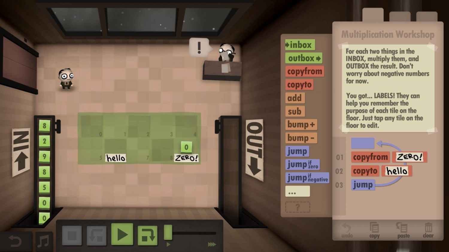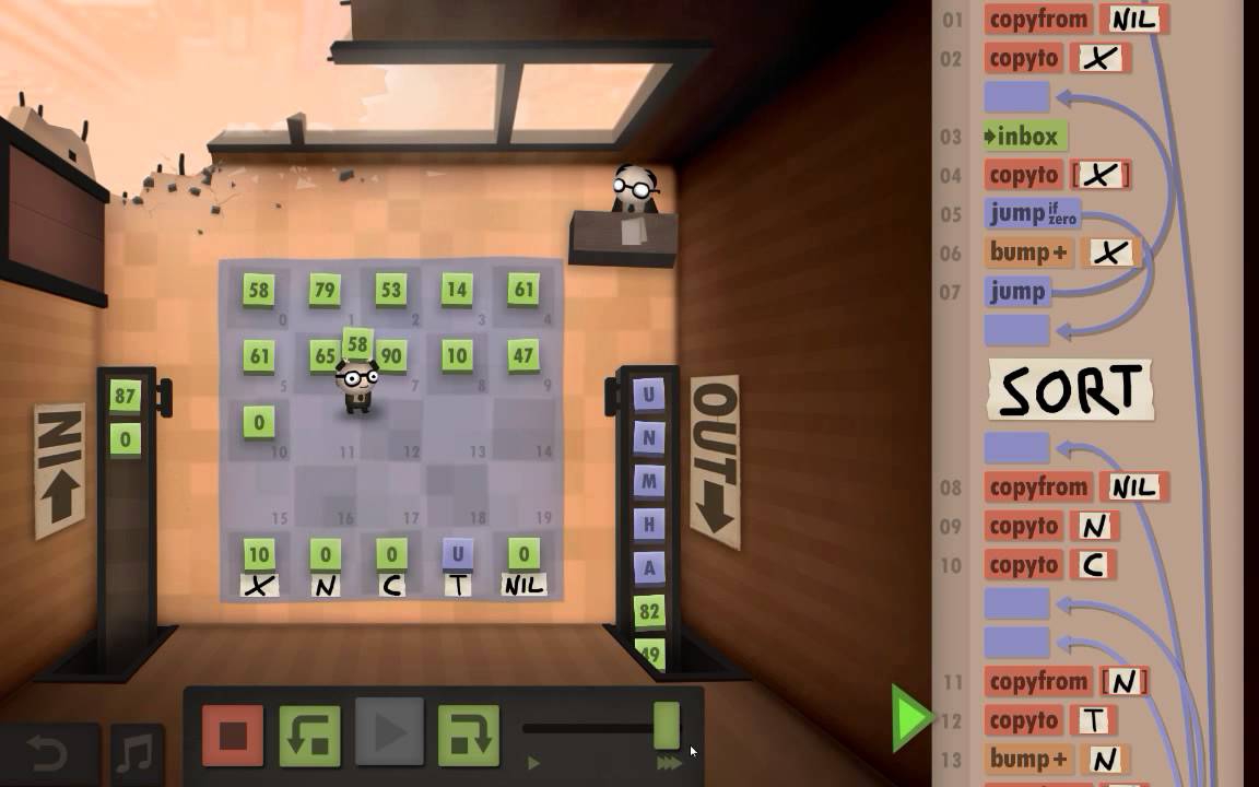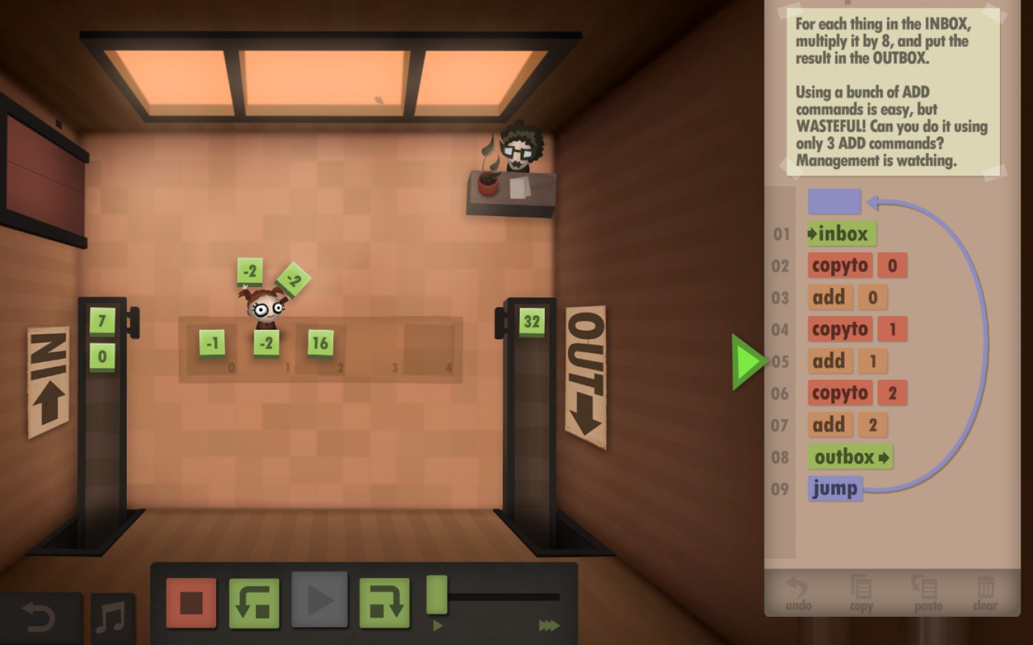 Der Spieler verkettet via Drag and Drop simple Befehle, die unser Büroarbeiter dann Schritt für Schritt bearbeitet, um so die vorgegebene Ausgabe zu erhalten. Beispielsweise kann ein Objekt in der Inbox abgeholt und auf einer bestimmten Fläche platziert werden. Ein solches Objekt ist eine Box mit einer Zahl oder einem Buchstaben darauf. Eine weitere Anweisungsfolge könnte lauten, etwas wiederholt auszuführen, bis eine Zahl, von der in jeder Wiederholung eins abgezogen wird, gleich Null ist. Ehe man sich versieht hat man plötzlich einen Algorithmus „programmiert“, der kleine bekannte Probleme aus der Mathematik oder Informatik löst. So führt dieses Spiel zu einem Grundverständnis der Funktionsweise von Computern und schult eine in der Informatik sehr hilfreiche Denkensweise, ohne dass man danach gefragt haben mag.