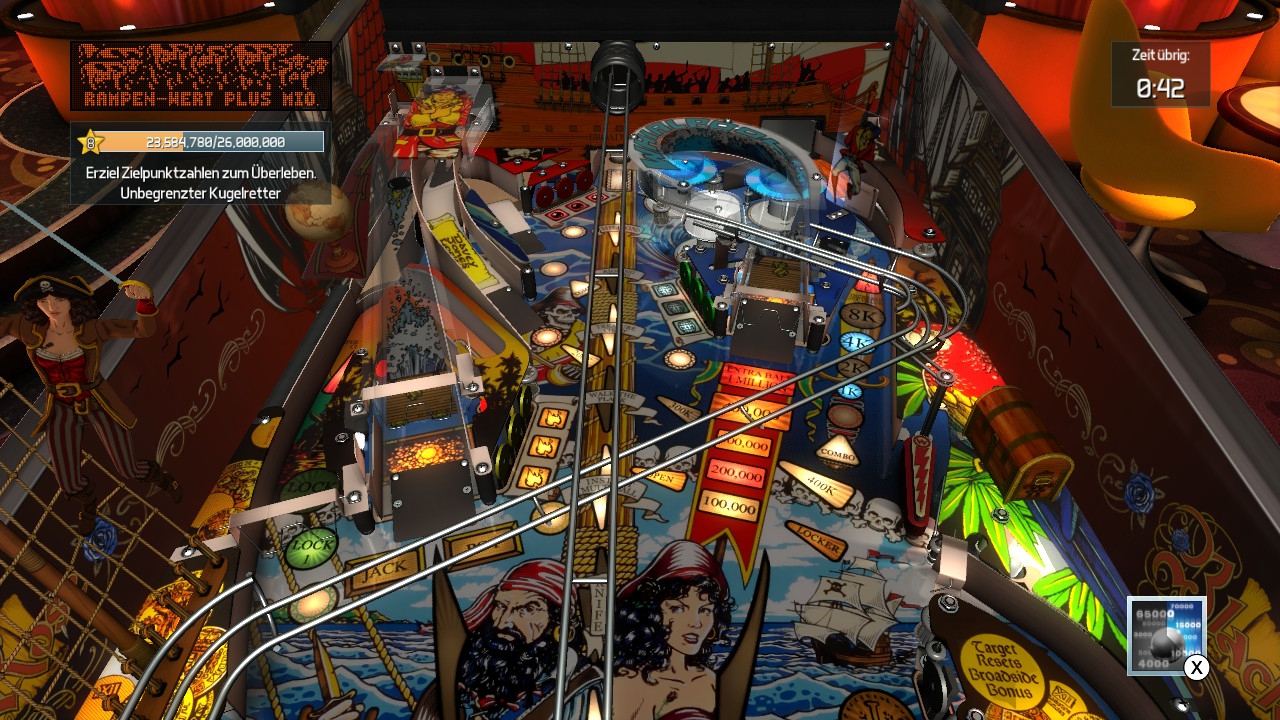 Das Schlusslicht des Trios bildet Black Rose. Das allgemeine Design verrät es schnell: Hier geht es um Piraten! Und Schiffskämpfe! Also eigentlich steht der Schiffsbeschuss so ziemlich im Zentrum der ganzen Kiste, denn die zentral verlaufende Schiene sowie die unten am Spielfeld angebrachte Kanone simulieren entsprechende Schüsse – nur dass dafür eben die gute, alte Silberkugel herhalten muss. Wer hier groß punkten will, muss auch entsprechende Zielfähigkeiten beweisen und den Umgang mit der Kanone meistern. Bis dahin will jedoch viel erledigt werden. So lässt sich etwa die Kugel am linken Rand für einen schnellen Multiball bunkern, man versucht sich in diversen Video-Modi am Messerwurf und Wettschwimmen mit einem Hai oder man begibt sich auf Schatzsuche. Sind genug Nebenziele erfüllt, muss nur noch die Kanone geladen und mit einem gezielten Schuss das am oberen Rand befindliche Schiff versenkt werden. Wer noch mehr Punkte absahnen möchte, wiederholt die Breitseitentreffer bis zum Äußersten. Auf diese Weise mausert sich Black Rose zu einem ziemlich technischen Tisch, bei dem man vor allem ein gutes Auge und noch bessere Zielfähigkeiten braucht – andernfalls sieht man hier kein Land mehr und wird wohl auch schon an den recht knackigen Basis-Zielpunktzahlen der Herausforderungs-Modi scheitern.