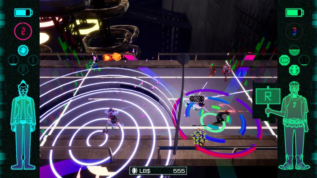Ähnlich sieht es leider auch beim Gameplay an sich aus. Aufs Gröbste heruntergebrochen handelt es sich bei Travis Strikes Again um ein simples Hack 'n' Slay, bei dem ihr wahlweise Travis, Bad Man oder im lokalen Koop-Modus gar beide zugleich durch die Death Drive-Spielwelten jagt und scharenweise als Gegner auftretende Bugs zersäbelt. Ganz so anspruchslos, wie das hier klingt, ist die Sache dann aber doch nicht. So wollen die verschiedenen Gegnertypen unterschiedlich angegangen werden und gerade spätere Stufen stellen euch nur zu gerne Sonderfeinde in den Weg, die auf speziellem Wege beseitigt werden müssen. Seien es Bugs mit Sprengsätzen, stabil gebaute Schildträger oder flinke Schwertschwinger, nicht selten verlangt euch das Spiel schon auf mittlerer Schwierigkeitsstufe einiges ab. Um die Chancen etwas auszugleichen, könnt ihr in den Leveln Skill-Chips finden, die sich dann ausrüsten und über einfache Tastenkombinationen aktivieren lassen. Dann verschießen die beiden Hauptakteure Blitze aus ihren Händen, errichten Mauern oder ordern einen satellitengestützen Laserschlag – alles, um das Feindvolk noch effektiver vom Bild zu fegen. Wer gut spielt, lädt zudem eine Spezialanzeige auf, mit der sich dann über die R-Taste verheerende Sturmangriffe entfesseln lassen. Diese werden sogar effektiver, sofern man sich zwischen den Einsätzen nicht treffen lässt. Kurzum: Es gibt einige Möglichkeiten, seine Spielweise zu verbessern und tatsächlich so etwas wie Skill einzubringen. Oh, und natürlich muss bei allem auf den Ladestand der Primärwaffe geachtet werden, die entweder mit dem rechten Analogstick oder stilecht über Geschüttel des rechten Joy-Cons aufgeladen wird. Es ist schließlich immer noch No More Heroes.