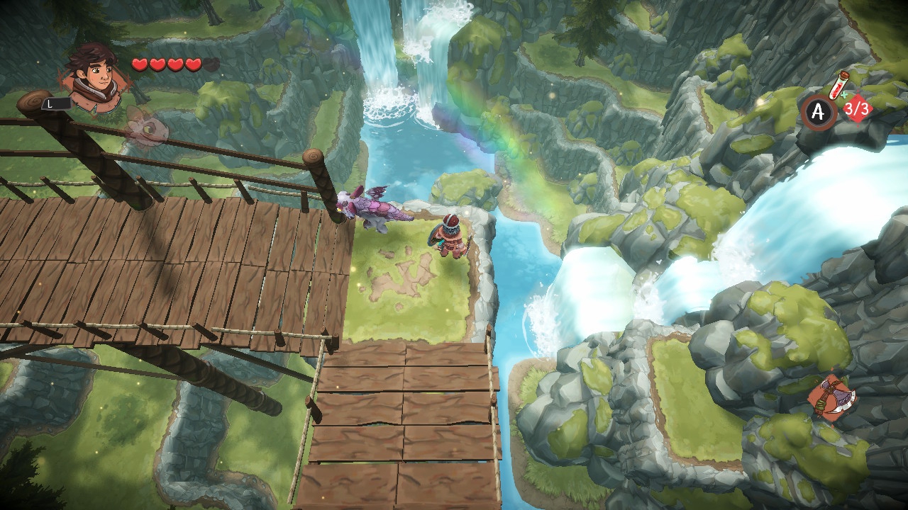 Die gelegentlichen Kämpfe, in denen ihr kleinere Monster, Fallensteller oder auch benebelte Drachen konfrontiert, verlängern dieses Erlebnis ebenfalls nicht sonderlich. So stürzen sich Scribbler und Patch stets gemeinsam im Gefecht, wobei der menschliche Teil des Duos mit simplen Angriffskombinationen aufwarten kann und sich mit geschickten Ausweichrollen schnell hinter den Rücken des Feindes bugsiert. Patch hingegen verlässt sich ganz auf seine Feuerkraft und eignet sich daher mehr für den Fernkampf. Elemente wie Unterstützungsangriffe von geretteten Drachen oder erstellbare Stärkungsobjekte sollen dabei für etwas mehr Tiefgang sorgen, die meisten Kämpfe sind jedoch dermaßen simpel, dass ihr sie nicht benötigen werdet. Auch bei den Bosskämpfen ist dies der Fall, wobei diese zumindest über relativ eingängige und nette Puzzles verfügen, die das Geschehen gekonnt auflockern. Und Stichwort Erstellbares: Während diverse Truhen Tränke oder Herzcontainer enthalten, steckt in den meisten von ihnen Crafting-Gut, das bei der umherziehenden Späherin Astrid oder dem Schmied Grobian in Heiltränke oder Rüstungs-Upgrades gesteckt werden kann. Speziell die Materialien für die Hilfsobjekte von Astrid sind jedoch dermaßen omnipräsent, dass ihr bereits auf halbem Weg durch das Spiel deutlich mehr von ihnen habt, als dass ihr sie je ausgeben könntet. Das nimmt der Suche nach Schatztruhen ein wenig ihren Reiz.