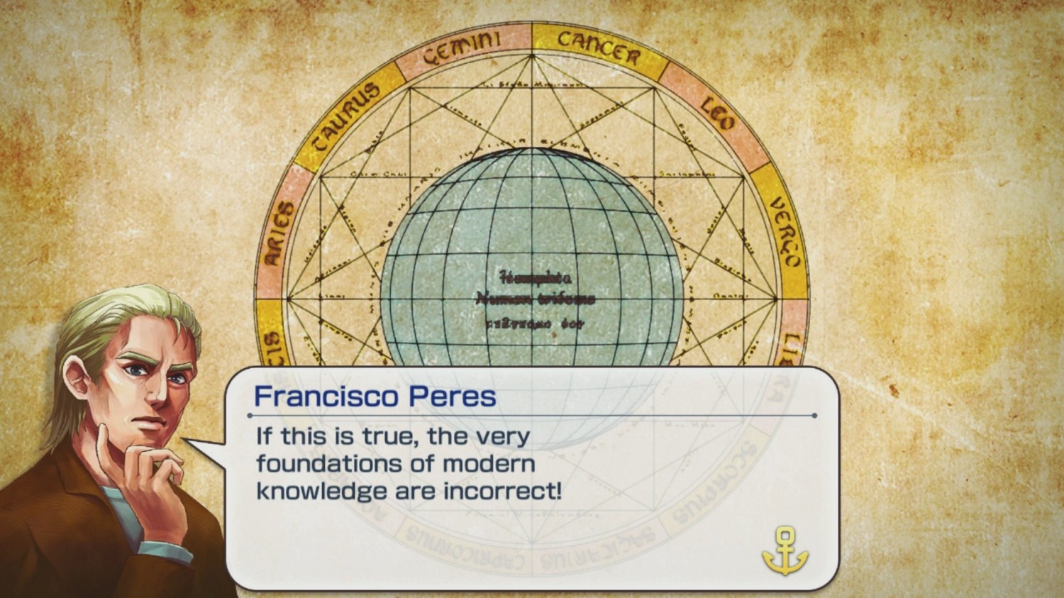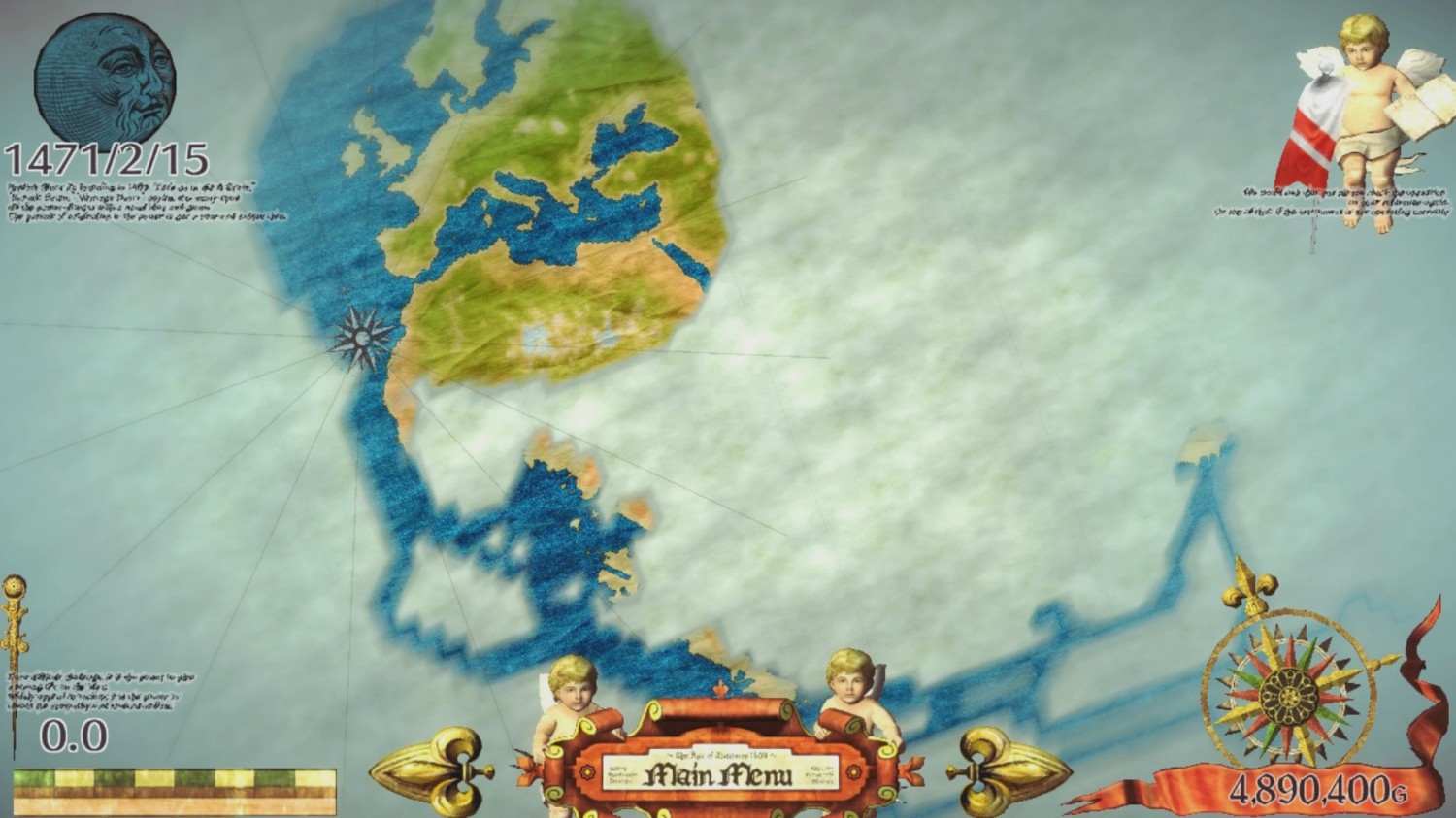Diese Geschehnisse werden alle über Dialoge erklärt, während ich gleichzeitig eine Einführung in die Grundlagen der Steuerung erhalte. Das gesamte Gameplay besteht dabei aus einer Ansicht der damals bekannten Weltkarte von Europa und einigen Teilen Afrikas, auf der ich mit meinem Cursor Häfen, Produkte zum Handeln und wichtige Orte untersuchen sowie über ein Menü meine Flotten navigieren kann. Spezielle Expeditionsflotten werden von ihren Heimathäfen ausgesendet um unbekannte Gebiete aufzudecken, die nur so von Gefahren wie Riesenkraken, Stürme und Piraten strotzen. Die Position, Form und Größe von Inseln und Kontinenten müssen dabei nicht zwingend mit der heutigen Weltkarte übereinstimmen. Das ist nämlich auch der Kniff an diesem Titel, sodass die Welterkundung stetig neue Überraschungen birgt, wobei ich jedes Mal nach Ende jeder Reise entscheiden kann, ob ich mit dem Ergebnis der Expedition einverstanden bin. So gibt es vielleicht mehr Kontinente, vielleicht auch weniger oder die restlichen Landmassen außer Europa bestehen aus Inseln. Schlussendlich kann ich dann noch bestimmen, ob Peres mit seiner Theorie einer runden Erde recht hat oder der Planet gar flach ist, auf einer Schildkröte durch das Universum treibt oder vom starken Gott Atlas auf den Schultern getragen wird.