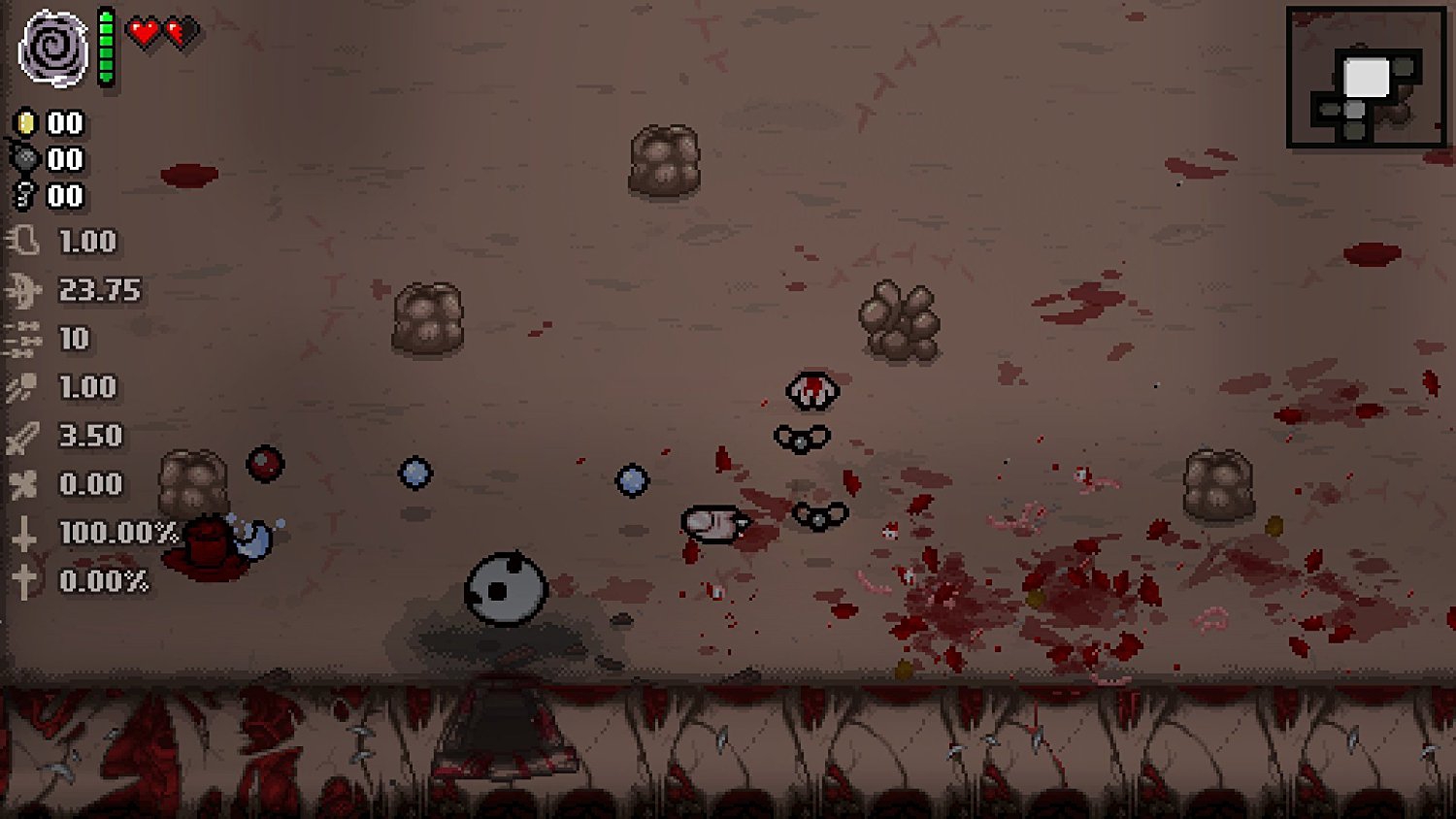 Ich wache also als Isaac am Kellerboden auf und kann mich sowohl mit dem linken Analogstick als auch mit den Pfeiltasten in alle Himmelsrichtungen bewegen. Mit dem rechten Analogstick, beziehungsweise den Aktionstasten rechts kann ich Tränen in jede Richtung verschießen, unabhängig davon in welche Richtung ich gerade laufe. Die Umgebung um meinen Charakter herum ist wie ein Dungeon aus dem allerersten Zelda aufgebaut: Rechteckige Räume sind zufällig aneinander angereiht und können über Türen betreten werden. Diese sind allerdings verschlossen, wenn noch nicht alle Gegner im Raum besiegt wurden. In meinem Abenteuer durch den Keller und dessen Untergrund stehen mir außerdem zahlreiche hilfreiche Items zur Verfügung: Mit Bomben kann ich verschlossene Türe, Gegner, Steine und geheime Verstecke aufsprengen. Schlüssel öffnen abgeschlossene Truhen und Türen ganz ohne Explosionen. Ganz wichtig sind die sogenannten Pickups, die dauerhafte Verbesserungen oder temporäre Aktionsmöglichkeiten bieten. Die Permanenten verändern dabei das Äußere von Isaac, sodass irgendwann der ganze Körper mit allen möglichen Auswüchsen überwuchert ist. Die Temporären müssen dagegen erst mit einem Druck auf die linke Schultertaste aktiviert werden und füllen sich danach mit jedem geschafften Raum wieder auf.