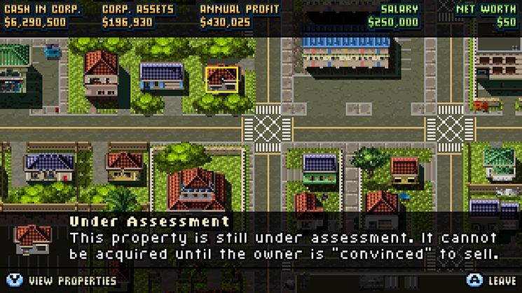 So entdeckt der Chef von Feeble Multinational immer wieder neue Wege seine Allerweltsprodukte mit plumpen Werbeversprechen und katastrophalen Produktionseinsparnissen an den Mann zu bringen. Innerhalb der einzelnen Missionen kommandiert er seinen Mitarbeiterstab herum und tritt auch selbst in Aktion wenn es darum geht, die künftigen Geschäftspartner noch ein wenig zu überzeugen. Das drückt sich meistens in simplen Missionszielen wie dem Erschießen diverser Gegner, dem Erreichen verschiedener Checkpoints per Auto oder per Pedes und dem Kaufen von neuen Gebäuden und Grundstücken aus. Es folgt ein abschließender Dialog mit den Angestellten und der Startpunkt für die nächste Mission wird angezeigt. Ansonsten marschiert der Firmenchef durch die Pixelstadt, die bis auf die Häuser und das Meer komplett zerstörbar ist. Auch zahlreiche Waffen bieten einiges an Zerstörungspotential, was allerdings aufgrund der schwachen Polizeipräsenz recht schnell langweilig wird. Zwar kann das Fahndungslevel ein wenig ansteigen, mehr als wenige Polizeimotorräder, ein paar Streifenwagen und hier und dort Polizisten zu Fuß sind nicht anzutreffen, selbst wenn eine Amokfahrt durch die Fußgängerzone stattfindet. Dank zufällig erscheinenden Pickups, die die komplette Fahndungsstufe löschen, ist der Spaß dann auch schnell wieder vorbei.
