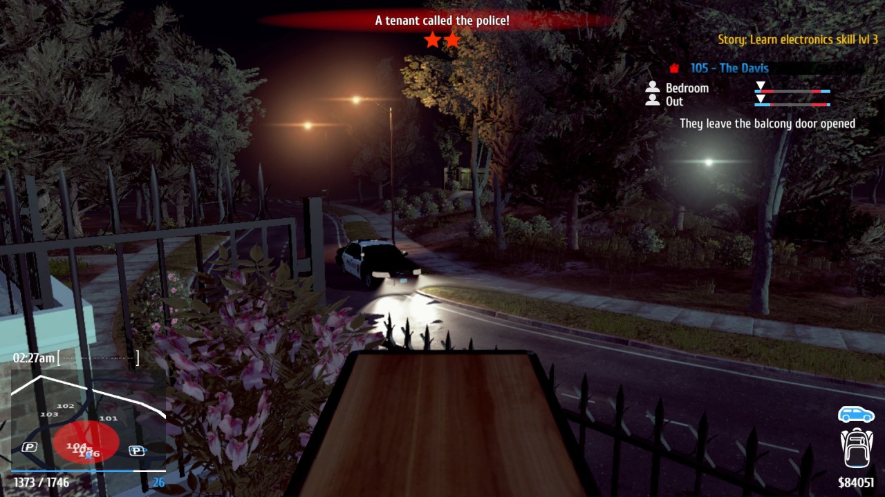Immerhin wird der sonst so triste Diebesalltag schnell schwerer. Räumt man anfangs noch menschenleere Häuser aus, tummeln sich dort später schon ganze Familien, die ihren Gewohnheiten nachgehen. Hier kommt dann neben dem Planen des Einstiegs, auch noch das Beobachten der Routinen und das Abpassen des richtigen Zeitpunkts. So kann man beispielsweise – entsprechende Werkzeuge vorausgesetzt – ganz einfach nachts einsteigen, sollte dabei aber Lärm möglichst vermeiden. Kurioserweise schlich ich einmal extrem vorsichtig am offenen Schlafzimmerfenster vorbei und wurde aber sofort erwischt, da der Bewohner scheinbar mit offenen Augenschläft und bei jedem Rascheln die Polizei ruft. Kein Problem, denkt man sich als erfahrener Langfinger. Ein Sprung in die Mülltonne und schon läuft die herbeigerufene Polizei ins Leere. Das kann man sogar so weit treiben, dass man direkt vor dem in die Straße einbiegenden Cop-KFZ in die Mülltonne steigen kann. Es kommt sogar teils ein Amtsträger bis vor die Luke gelaufen! Dort bleibt er jedoch in den meisten Fällen nur kurz stehen (genießt den Geruch oder so) und sucht dann wieder das Weite. Selten musste ich beim Test eines Videospiels so lachen, das es nicht auf einen Witz angelegt hat.