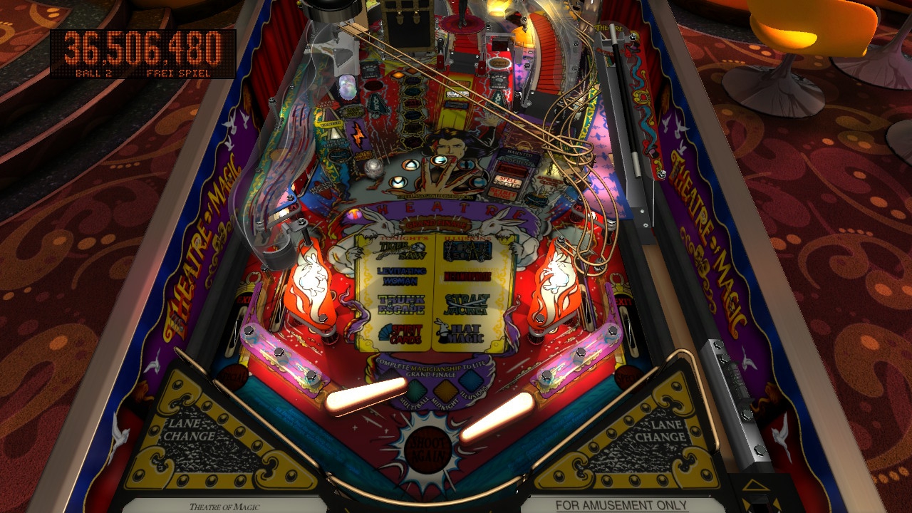 Gehen wir das Trio also mal wieder der Reihe nach durch. In Theatre of Magic mimt ihr den Bühnenzauberer und müsst dafür sorgen, dass die zahlreichen Tricks auch reibungslos verlaufen. Zum Start muss dabei in der Regel der große Zauberkoffer im linken Mittelfeld des Tisches anvisiert werden und auch während der Zauberei wird der kubische Kasten häufig zum Hauptziel gemacht – sei es, weil ihr in seiner Tasche eine Kugel zu versenken habt, oder weil die magnetische Seite nach einem dekorativen Metallball schreit. Wer auf den reinen Punkterausch steht, kommt dabei übrigens voll und ganz auf seine Kosten: Die Missionsziele mögen in der Regel eher simpel strukturiert sein, dafür hagelt es aber Punkte in Millionenhöhe. Allein für den anfänglichen Kunstschuss kann man schon mal ein paar Millionen kassieren. Ein paar visuelle Nettigkeiten wie der (leider etwas verwaschene) Spiegel im Hintergrund oder die im Remaster-Modus animierten Tricks der Zauberin im Spielfeldzentrum runden das Erlebnis gekonnt ab.