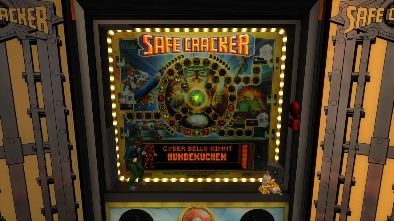 Bis hierhin war das Flipper-Aufgebot noch äußerst gewöhnlich. Wenn ihr jedoch eine bedeutend andere Erfahrung haben möchtet, die sich von üblichen Pinball-Konventionen freispricht, dann ist Safecracker einen Blick wert. Das Ziel ist simpel: Ihr sollt eine Bank ausrauben. Anders als bei regulären Flippern müsst ihr zu diesem Zweck jedoch nicht drei Kugeln haushalten, sondern arbeitet unter einem strikten Zeitlimit, währenddessen ihr stets mit neuen Stahlsphären versorgt werdet, sollte sie mal unten durchrutschen – erst nach Ablauf des Limits droht das tatsächliche Aus. Das Zeitkontingent kann dabei durch Erfüllen gewisser Aufgaben erhöht werden, deutlich lukrativer ist es jedoch, den großen Safe anzupeilen. Hierfür muss man lediglich in einen der drei Eingänge – Dach, Keller oder Vordereingang – einsteigen und schon wechselt die Perspektive zum Spielbrett im Kopfaufsatz des Tisches. Und nun wird es spannend, denn nur mit Würfelglück kommt man auch tatsächlich zum zentralen Tresor. Immerhin: Wird man gefasst oder von einem unliebsamen Ereignisfeld wieder zum Flipper-Feld zurückbefördert, kann man durch geschicktes Spiel wieder direkt dort einsteigen, wo man unterbrochen wurde. Der wahre Clou kommt jedoch beim erfolgreichen Beutezug: Ganz wie beim Originalautomaten erhält man dann nämlich eine Sammelmünze, die man bei der nächsten Partie einwerfen kann, um zum Sondermodus zu wechseln. Dann habt ihr 90 Sekunden, um so viele Punkte wie möglich einzufahren – und dieser Modus ist mit seinen Millionenwerten bedeutend lukrativer als eine Standard-Partie, bei der eine erste Million bereits eine respektable Leistung ist. Leider sorgt genau diese Diskrepanz zwischen den zwei Modi, dass sich der ganze Tisch eher halbgar anfühlt. So interessant das Gimmick an sich auch ist, macht die Punktehatz im Normal-Modus einfach nicht so viel Laune.