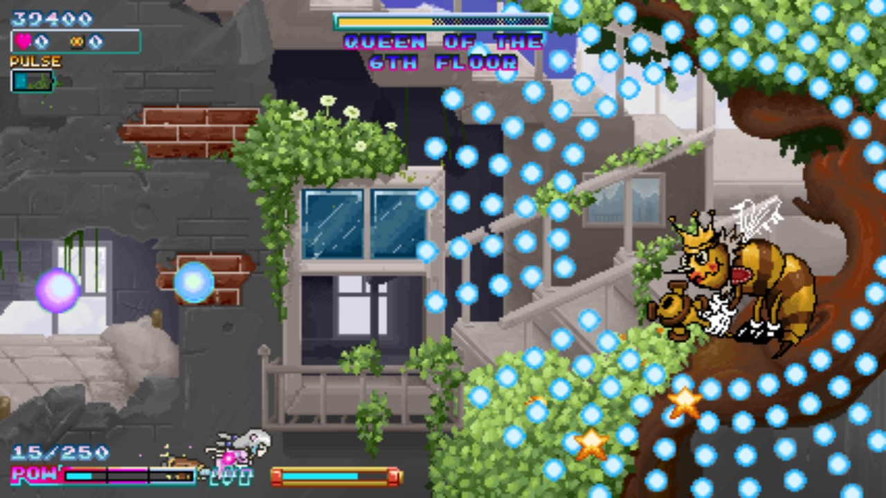 Denn ganz unter uns, wen kümmert bei einem Shoot 'em Up schon die Story? Eben. Die Action muss stimmen und das tut sie zumindest im Ansatz. Q-Yo Blaster orientiert sich spielerisch merklich am Bullet Hell-Subgenre und deckt euch speziell bei den Bossfights regelrecht mit Geschossen ein. Dank der gewohnt großzügig kompakten Trefferzone eures Charakters, die im einfachsten der Schwierigkeitsgrade sogar dauerhaft angezeigt wird, lässt sich aber jedes noch so flächendeckende Kugelmuster mit etwas Geschick umgehen. Schade ist jedoch, dass die Feindformationen insgesamt an Einfallsreichtum vermissen lassen. Zwar sind sie gerade im fortgeschrittenen Spielverlauf alles andere als einfach zu umgehen, doch in der Regel sorgen gelegentliche Trick-Gegner für den größten Stress. Dazu zählen nicht zuletzt die jeweiligen Levelbosse, die ab der normalen Schwierigkeitsstufe dank ihrer Unmengen an Trefferpunkten mehr Geduld und Ausdauer als allgemeines Können abverlangen – die langsam heruntertickende Energieleiste der Chefgegner motiviert jedenfalls nicht sonderlich. Selbst aufsammelbare Extrawaffen oder die Sekundärangriffe eurer Charaktere schlagen keine bedeutend größere Delle in den Panzer der Bosse.