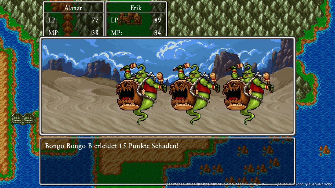Die Speicherprediger sind übrigens auch der Punkt, an dem ihr von einem der neuen Features der Switch-Version Gebrauch machen könnt. Ganz wie beim japanischen 3DS-Gegenstück dürft ihr nämlich auswählen, ob ihr das Abenteuer in seiner dreidimensionalen HD-Pracht bestreiten wollt, oder ihr den zweidimensionalen Old-School-Stil aus 16-Bit-SNES-Tagen bevorzugt. Nachdem ihr euch für eine Startvariante entschieden habt, könnt ihr ausschließlich an Speicherpunkten zur jeweils anderen Variante wechseln. Das hat jedoch auch einen tieferen Sinn, denn die 2D-Version ist kein Eins-zu-Eins-Nachbau des 3D-Gegenstücks. Vielmehr haben sich die Macher tatsächlich Gedanken gemacht, wie die Umgebungen ausgesehen hätten, wenn man sie eigens für das SNES gebaut hätte – deutlich kompakter mit einer komplett zusammenhängenden Oberwelt und reichlich Zufallskämpfen. Zusammen mit den nun weniger aufwendigen Dialogsequenzen macht die 2D-Version das Abenteuer somit bedeutend kompakter und ist ideal für diejenigen, die ein wenig schneller durch das Abenteuer kommen möchten. Leider ist man dem klassischen Grafikstil dabei stellenweise womöglich auch etwas zu treu geblieben, denn gerade die Kämpfe wirken auf diese Weise extrem statisch, da sie logischerweise die verspielten Animationen der 3D-Variante vermissen lassen. Ebenfalls unschön: Gerade weil die Struktur der Gebiete sich dermaßen stark zwischen der modernen und klassischen Version unterscheidet, könnt ihr nicht nahtlos von einer in die andere wechseln. Stattdessen werdet ihr beim Dimensionswandel in eine Kapitelauswahl befördert und könnt entscheiden, ab welchem Eckpunkt ihr wieder einsteigen möchtet – dies sogar mit eurer aktuellen Ausrüstung, Geldmittel und Erfahrung; lediglich handlungsrelevante Objekte werden zurückgesetzt. Im Prinzip sollte man sich die beiden Modi also wie unterschiedliche Spielstände vorstellen, was übrigens auch durch die zwei dafür vorgesehenen Auto-Save-Slots verdeutlicht wird. Ärgerlicherweise könnt ihr übrigens beim Wechsel nicht Kapitel wieder vorausspringen, falls ihr zuvor im jeweils anderen Modus weiter wart. Beim Überschreiben von Savegames ist entsprechend also Vorsicht geboten.