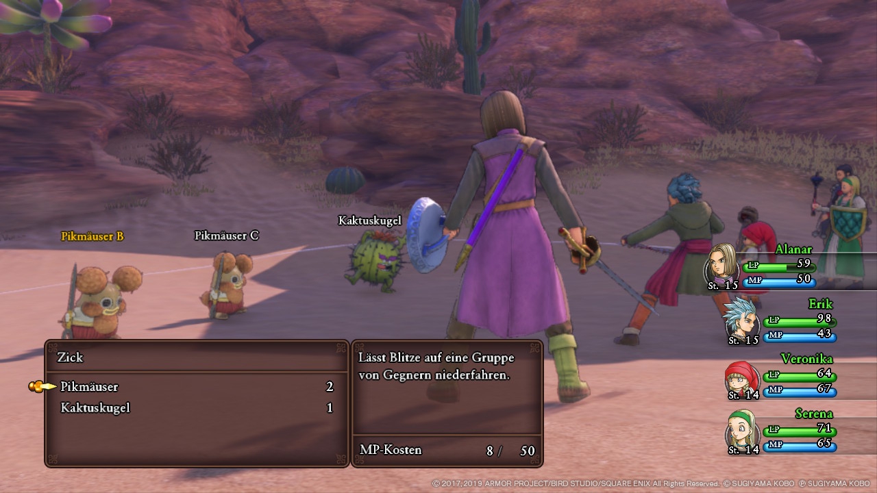 Ich habe es ja schon anklingen lassen, doch über kurz oder lang muss natürlich auch gekämpft werden. Hier gibt sich Dragon Quest XI ganz klassisch: Die rundenbasierten Gefechte lassen alle Teilnehmer gemäß ihres Flinkheitswerts ziehen und wenn eines eurer Gruppenmitglieder an der Reihe ist, wird aus einem aufgeräumten Auswahlmenü die passende Aktion herausgepickt. Zu Beginn sind das noch simple Waffenangriffe, mit zunehmenden Levelaufstiegen und der Ausgabe von erlangten Talentpunkten lassen sich jedoch weitere Tricks lernen. So kann der Lichtbringer beispielsweise mit dem Drachenhieb drakonische Bestien drangsalieren, während Offensivmagierin Veronika Eiszapfen regnen lässt und Gaukler Rionaldo mit seinen Peitschenfähigkeiten Statuseffekte austeilt, um so Gegnergruppen unter Kontrolle zu bringen. Da der Schwierigkeitsgrad von Dragon Quest XI generell eher niedrig angesetzt ist, wird derartig strategisches Vorgehen höchstens bei den eingestreuten Bossgefechten notwendig. Für den Fall hat Square Enix jedoch vorgesorgt, denn ihr dürft auf Wunsch bei Spielstart diverse Modifikatoren hinzuschalten, die das Spiel dezent schwerer machen. Dann gewinnt ihr etwa weniger Erfahrungspunkte, erhaltet falsche Hinweise von Dorfbewohnern oder müsst ganz ohne die Möglichkeit zum Einkauf auskommen und euch ganz auf Schatzkistenfunde sowie Schmiedeerzeugnisse verlassen. Wer sich damit in den Ring wagt, muss auf lange Sicht aus den Vollen seines Arsenals schöpfen, um überhaupt Land zu sehen.