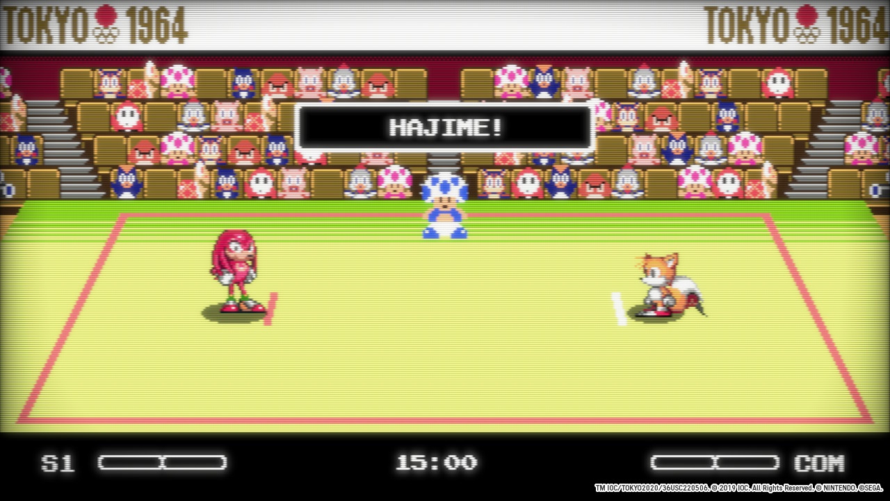 Das beginnt bereits bei der Modi-Auswahl, die sich im Prinzip auf drei Kategorien beschränkt: Ihr könnt euch im lokalen Schnellspiel allein oder mit bis zu drei weiteren Sportlern an allen 34 Disziplinen des Titels versuchen, entweder online oder im lokalen Drahtlosmodus mit anderen Switch-Besitzern wetteifern oder den mit um die fünf Stunden recht kompakten Story-Modus angehen. Letzterer ist leider äußerst simpel gestrickt und erzählt nicht einmal eine wirklich interessante Geschichte, obwohl die Prämisse gar nicht mal so unspannend klingt. Mario, Sonic, Bowser und Eggman werden nämlich durch eine Erfindung von letzterem in ein Retro-Videospiel hineingesogen, das die Olympiade des Jahres 1964 behandelt, und wollen nun natürlich wieder raus in die Moderne. Parallel dazu suchen Luigi und Tails in der realen Welt nach Möglichkeiten, den gefangenen Protagonisten (und zwangsweise auch den Erzschurken) zu helfen. Dabei dürft ihr diverse stilisierte Abbilder von Stadtbezirken und Stadien Tokios erkunden und lernt durch Trivia-Fragen auch einiges über diese sowie die Olympischen Spiele allgemein. Praktisch rennt ihr hierbei jedoch von einer belanglosen Unterhaltung zur nächsten und werdet hin und wieder in eine Sportdisziplin oder ein Minispiel geworfen – das ödet leider relativ schnell an. Hinzu kommt, dass ein paar der Texte in den Dialogboxen auch noch unfassbar klein dargestellt werden, was sie auf einer Switch Lite so ziemlich unmöglich zu lesen macht. Die wenigen auf diese Weise freispielbaren Extra-Charaktere, die jeweils nur an einer für sie vorgesehenen Disziplin teilnehmen können, machen dies auch nicht unbedingt wett.