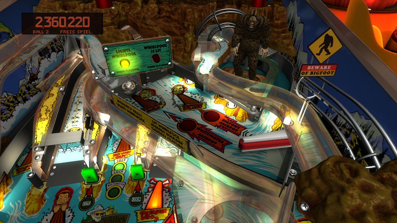 Doch bevor ich dazu komme, stürzen wir uns lieber in den Wildwasser-Trip White Water. Im Prinzip ist das Ziel so einfach wie auch logisch: Ihr müsst leuchtende Ziele und Bahnen abfahren, um nach und nach die Checkpoints der Stromschnellen abzuarbeiten. Unterwegs kann jedoch so einiges passieren. So gabelt ihr beispielsweise Souvenirs auf, kracht Wasserfälle herunter oder überrascht einen Bigfoot in seiner Höhle. Entsprechend des Themas geben sich die Bahnen und Rampen recht wellig und einen als Strudel dienenden Trichter gibt es ebenfalls auf dem Tisch. Das sorgt auf jeden Fall für ein stimmiges Spielgefühl. Mit dem Tempo der Arcade- und Turnier-Physik fühlt sich alles auch entsprechend wie ein haarsträubender Bootsausflug an – einfach lässt sich die Kugel dabei jedenfalls nicht im Spiel behalten. Dank abwechslungsreicher Ziele und spaßiger Modi stürze ich mich für meinen Teil jedoch immer wieder gerne in die Fluten.