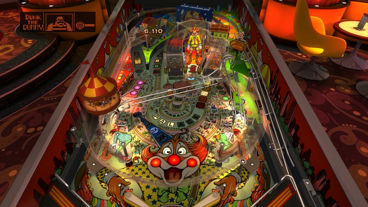 Das letzte Stück im Bunde ist Hurricane, bei dem es bestimmte Leute mit der Angst zu tun bekommen. Nein, es geht hier nicht um Naturkatastrophen oder Horror-Themen, stattdessen grinst ein prominenter Clown den Spieler die ganze Zeit von der unteren Tischhälfte aus an. Brr. Davon abgesehen: Hurricane ist der wohl aufgeräumteste der drei Volume 4-Flipper und gibt sich mit zwei unkomplizierten Rampen, einem Riesenrad und einem Roulette-Rad recht eingängig. Man hat schnell raus, wie der Hase in diesem Flipper-Vergnügungspark läuft, und kann sich entsprechend flott der Punktejagd verschreiben. Etwas Tiefgang bietet sich dennoch, denn mit bestimmten Aktionen lassen sich die Jackpots diverser Attraktionen gezielt erhöhen. Somit kommt ein immer noch spaßiges Flipper-Erlebnis zustande, auch wenn ich Hurricane auf einem hohen Niveau immer noch als das schwächste Glied der Sammlung bezeichnen würde.