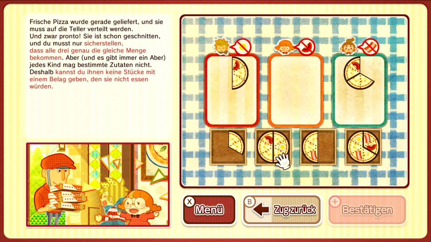 Ferner kommen mir die Aufgaben nicht ganz so gut verfasst vor, wie es bei den vorherigen Spielen der Fall war. Klar gehört zur Layton-Erfahrung auch die ein oder andere falsche Fährte, gerade bei den Trickrätseln. Ein paar der Aufgabenstellungen sind jedoch dermaßen unklar formuliert, dass ich beizeiten gar nicht wusste, was das Spiel überhaupt von mir möchte. Selbst waschechte Fehler finden sich hier und da in den Texten, was sich auch mal auf die Hinweise beziehen kann. Eines der neuen Verschieberätsel der Switch-Version ist beispielsweise nach der Schritt-für-Schritt-Anleitung im Tipp-Katalog gar nicht lösbar, weil die dort beschriebene Lage schlichtweg nicht existiert. Dank dieser Patzer bekam ich bei tatsächlich fairen Stolpersteinen daher immer wieder Zweifel darüber, ob ich nun etwas übersehen habe oder sich das Spiel wieder einen Fehler erlaubt hat. Und wo ich gerade schon die neuen Puzzles angeschnitten habe: Die Switch-Fassung bietet über 40 neue Knobeleien, denen ihr euch stellen könnt. Diese sind jedoch nicht zusätzlich zu dem aus 3DS und Mobile bekannten Kontingent implementiert worden, sondern haben schlichtweg bereits bestehende Aufgaben ersetzt. Nett gemeint, aber dadurch bekommt man leider nicht das Gefühl einer ultimativen Ausgabe des Spiels, zumal einige dieser Ersatzpuzzles nicht einmal wirklich gut sind. Herunterladbare tägliche Puzzles sowie eine solide Auswahl an Extra-Aufgaben gibt es übrigens auch in dieser Spielausgabe wieder.